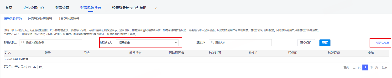 当邮箱账号的登录密码多次输入错误后,系统会锁定该邮箱账号。(在一段时间内,这个IP下无法登录这个邮箱)而管理员可以查看被锁定的邮箱账号以及给锁定的邮箱账号解锁。从“首页—安全中心—账号解禁”路径进入操作页面,如下图所示。