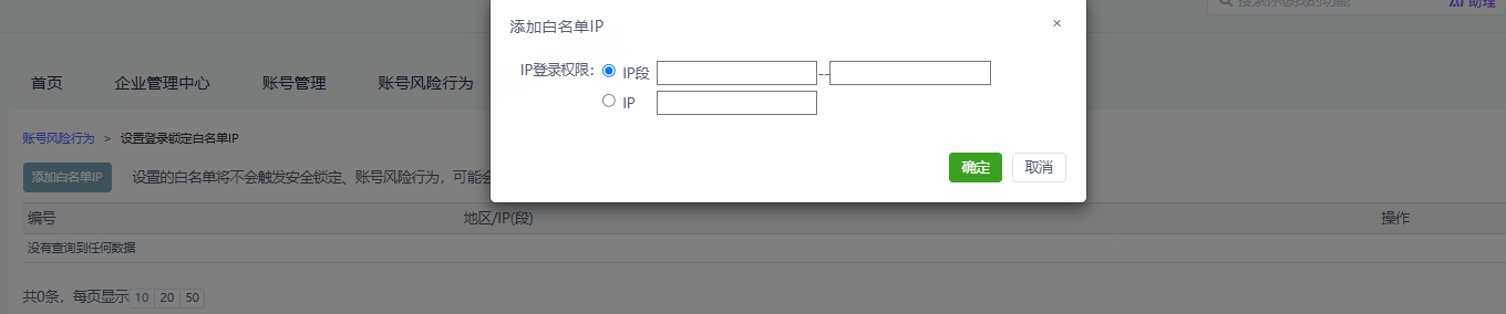 点击“添加白名单IP”,弹框如下图,您可以录入IP段、某个特定IP,用来添加到白名单中。