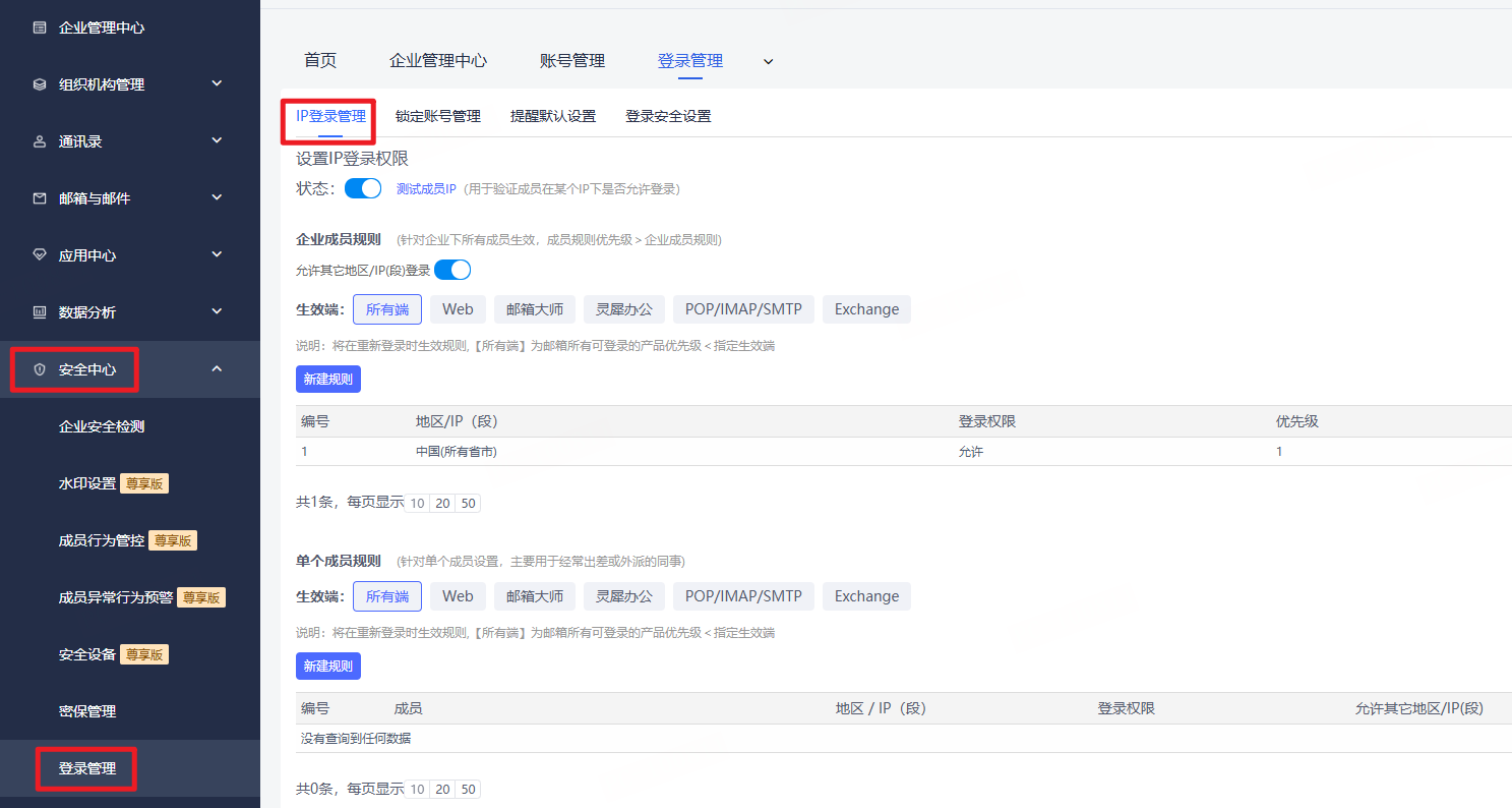 系统默认的选择是不做任何限制,如希望进一步保障账号安全,您可通过“新建默认规则”,来限制全体成员可访问邮箱的IP范围,也可以通过“新建个别规则”,来限制个别成员可访问邮箱的IP范围。