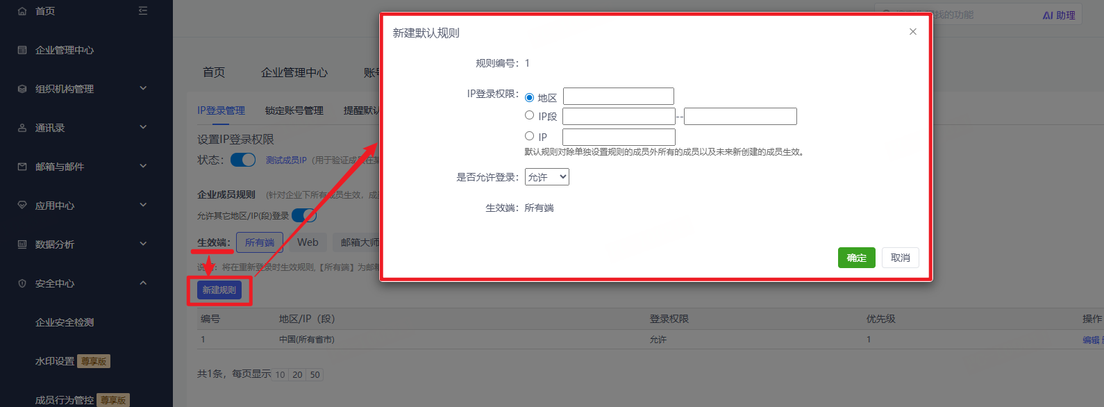 点击“新建规则”按钮,可先选择对应的生效端,再输入具体IP、IP段或地区,并选择是否允许在该IP范围内访问邮箱,最后点击“确定”即可。