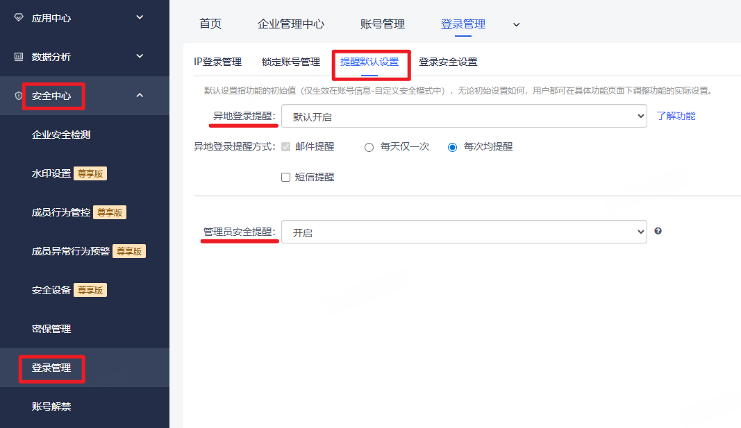 从“首页—安全中心—登录管理—提醒默认设置”路径进入操作页面,如下图所示。
