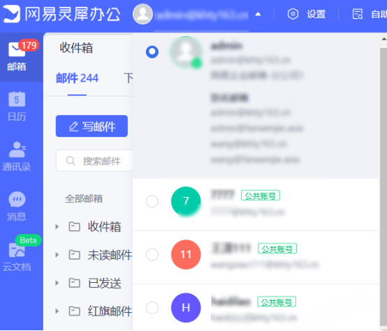 支持公共邮箱切换入口,用户可以在顶栏中(web端)切换主账号所绑定的公共邮箱账号;