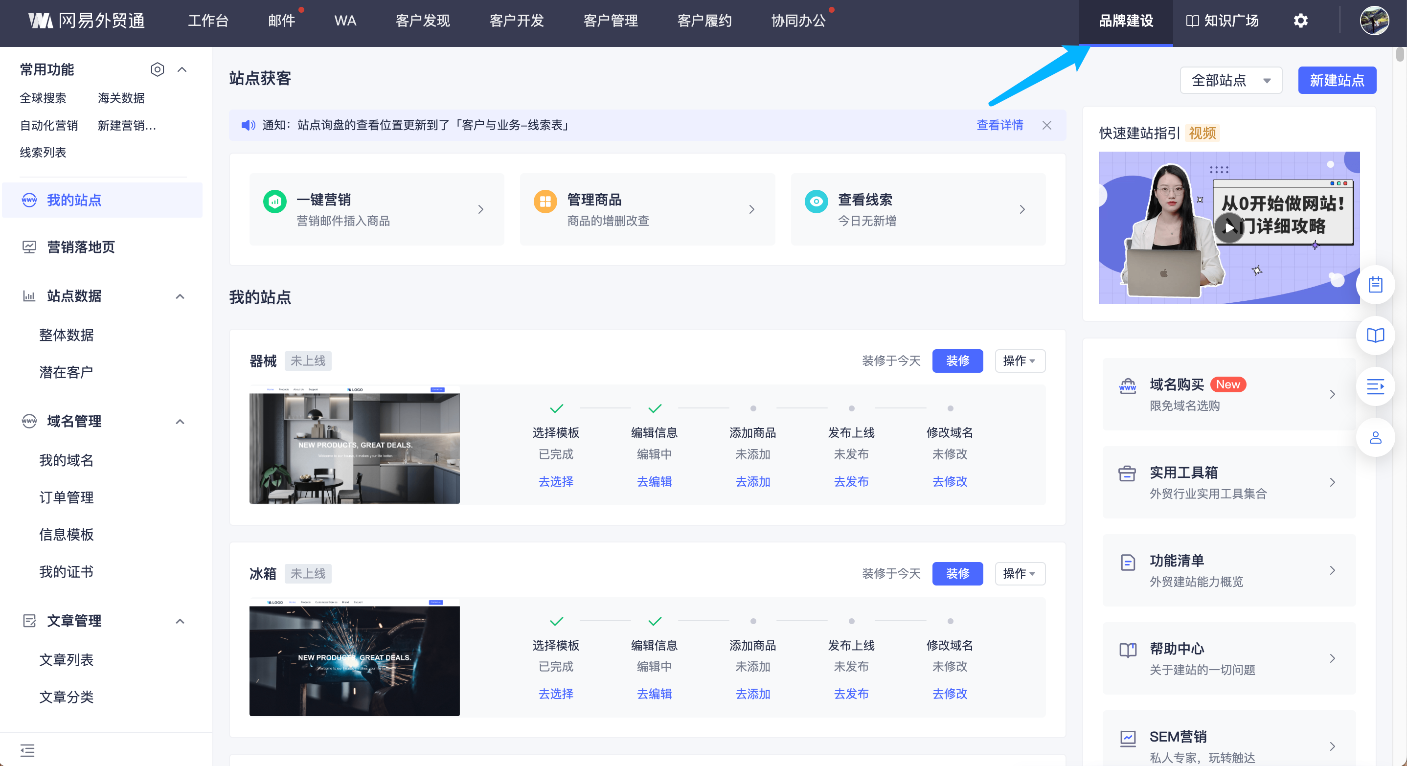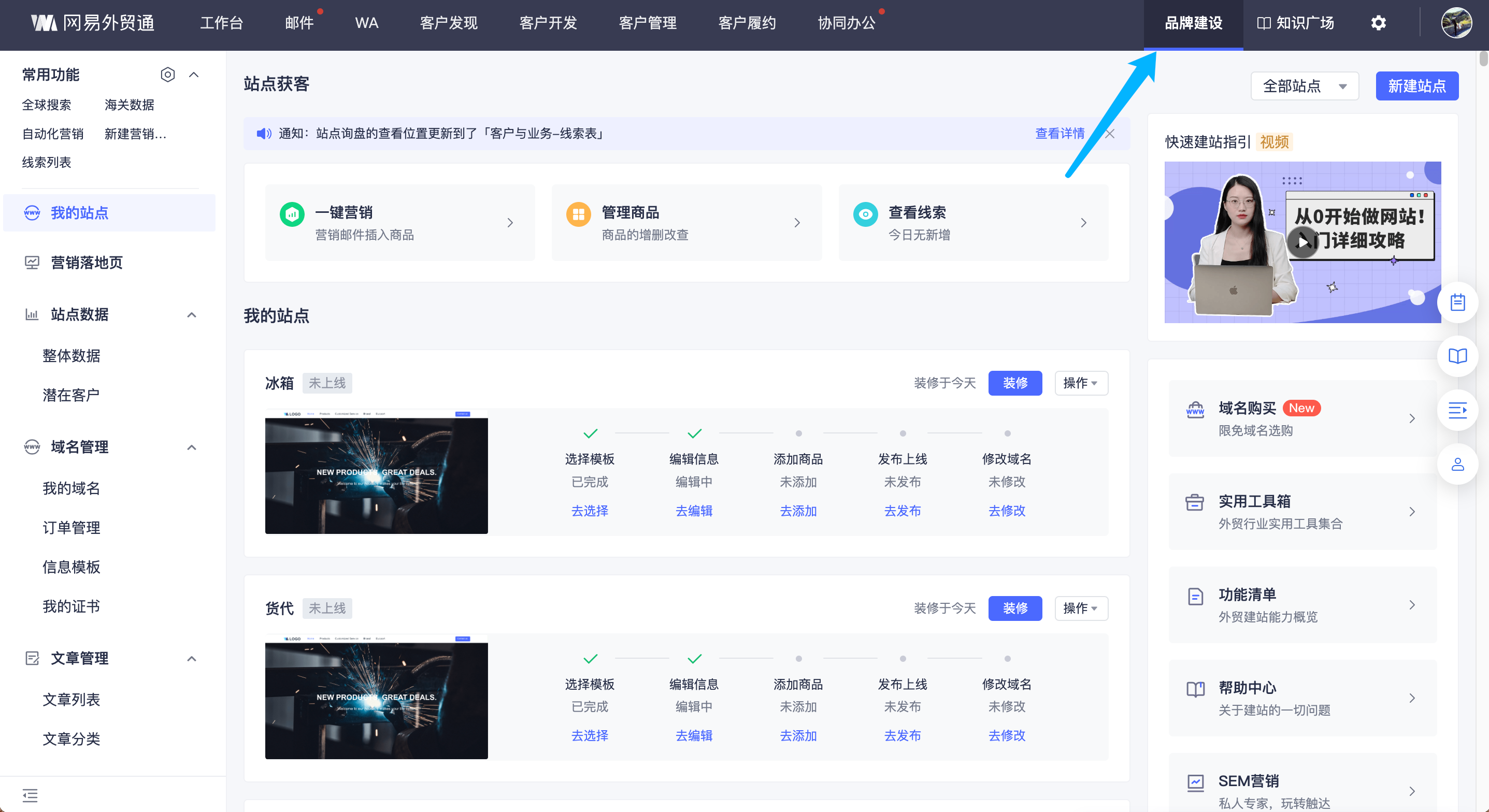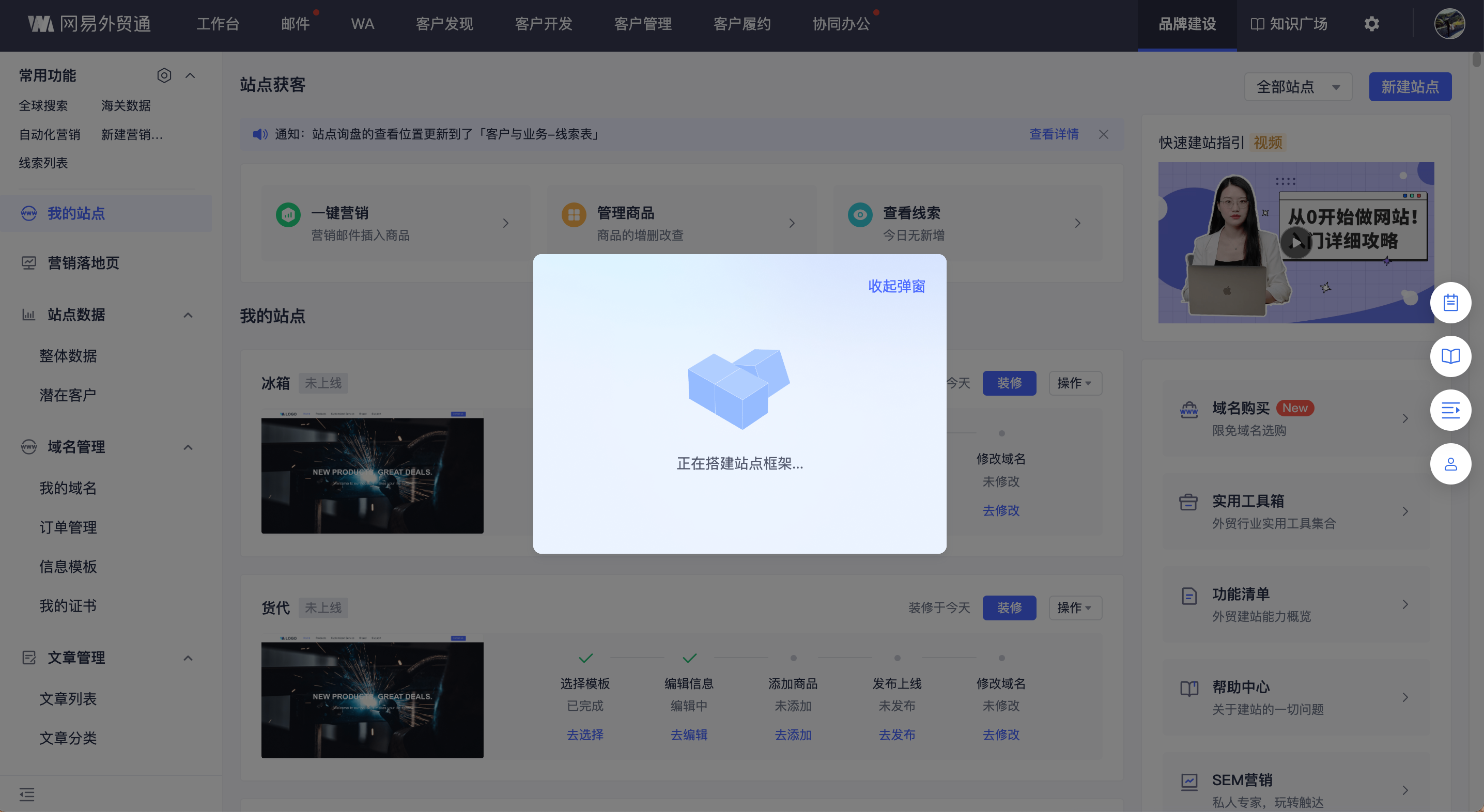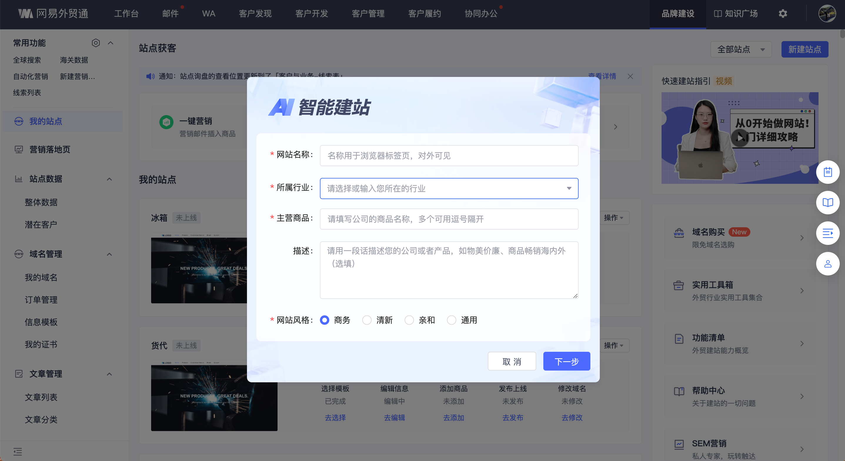 AI建站是网易外贸通建站的特色功能,可以基于企业所在的行业、商品等信息,自动生成匹配的图文,帮助企业快速完成网站的搭建。