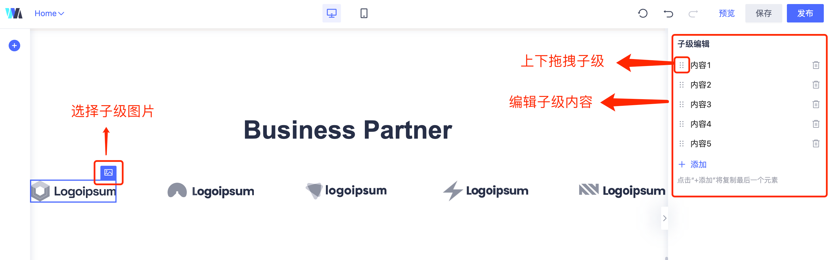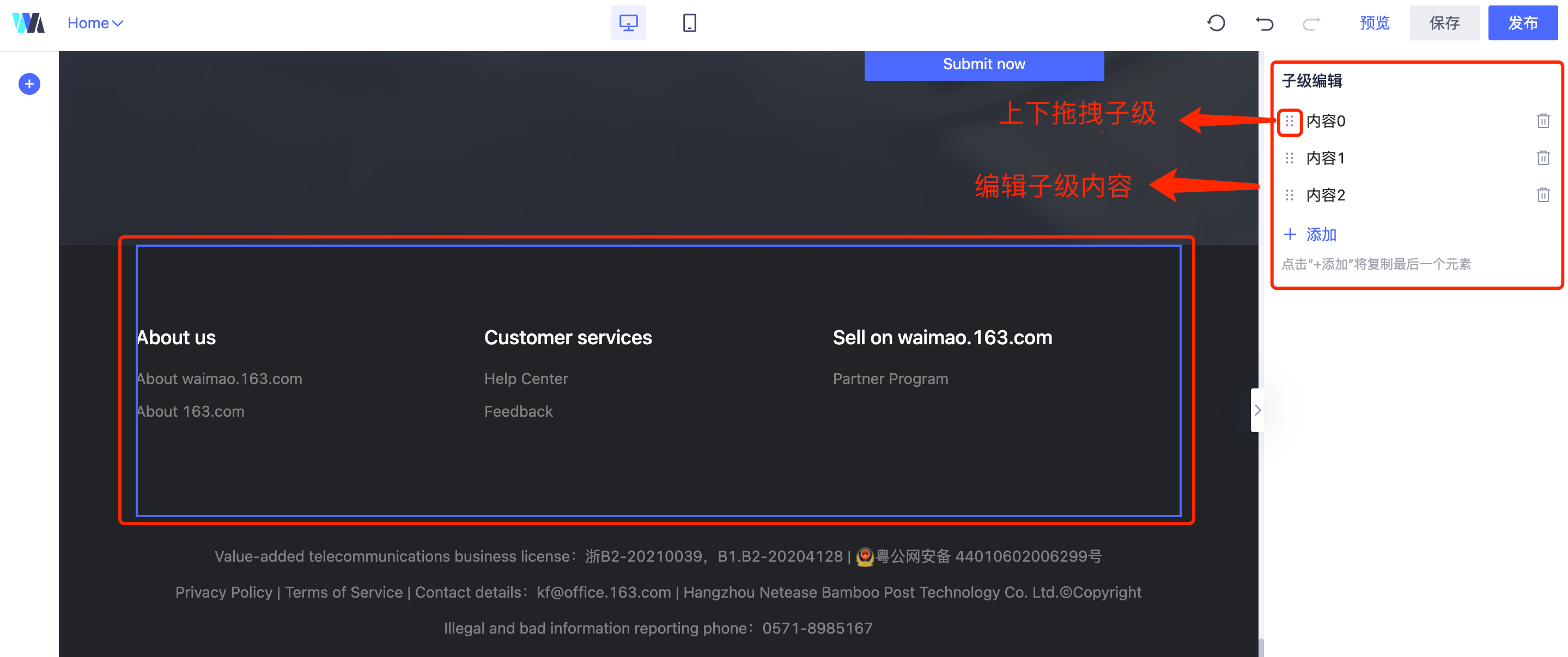 在右侧「子级编辑」中,可以「添加/删除」子级内容,并且每一个子级内容都可以自由上下拉拽「更改子级顺序」。