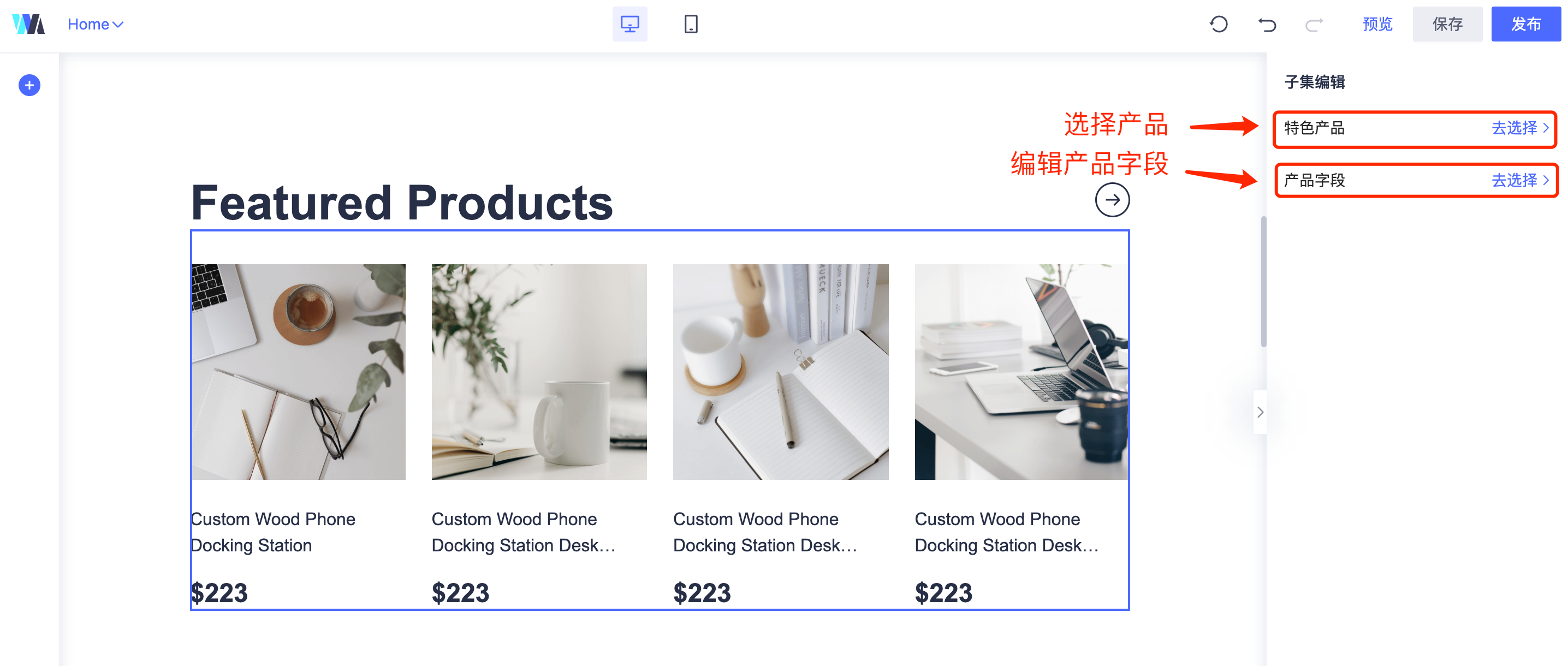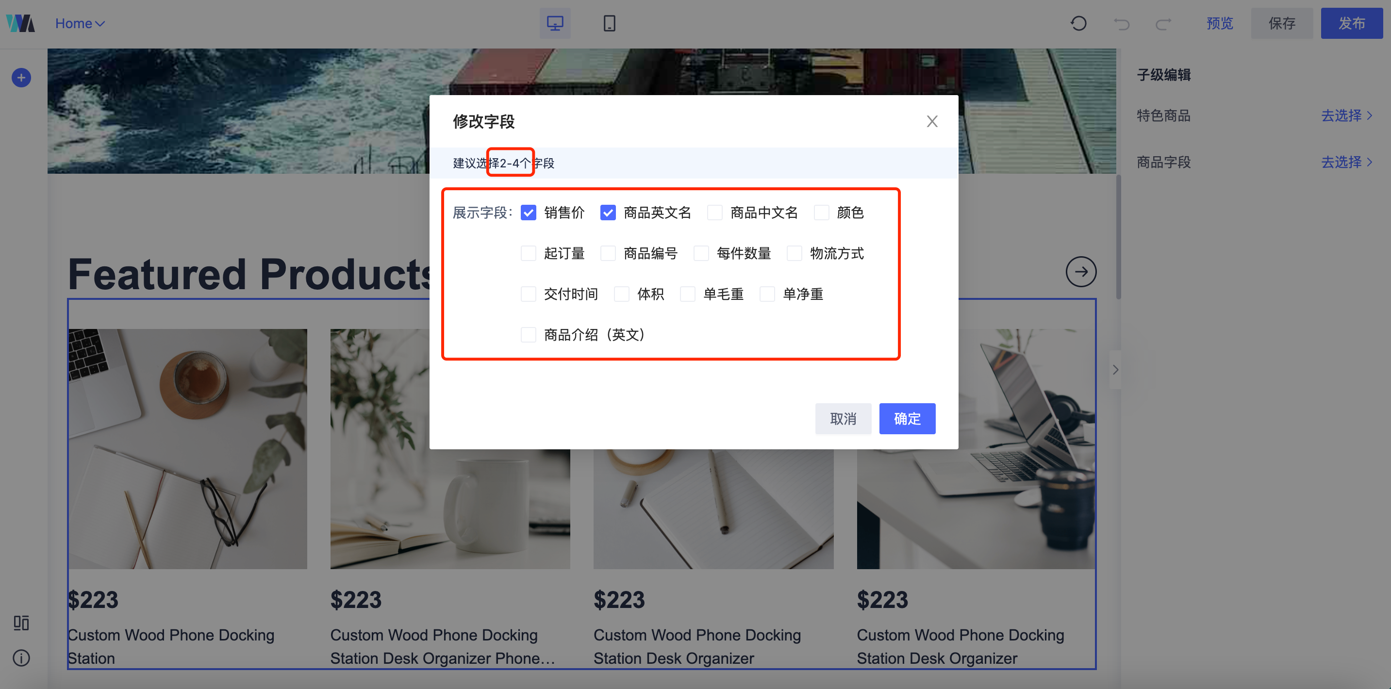在「子集编辑」中点击「产品字段」后,可以修改产品下方展示的字段。(可以选择2-4个字段)