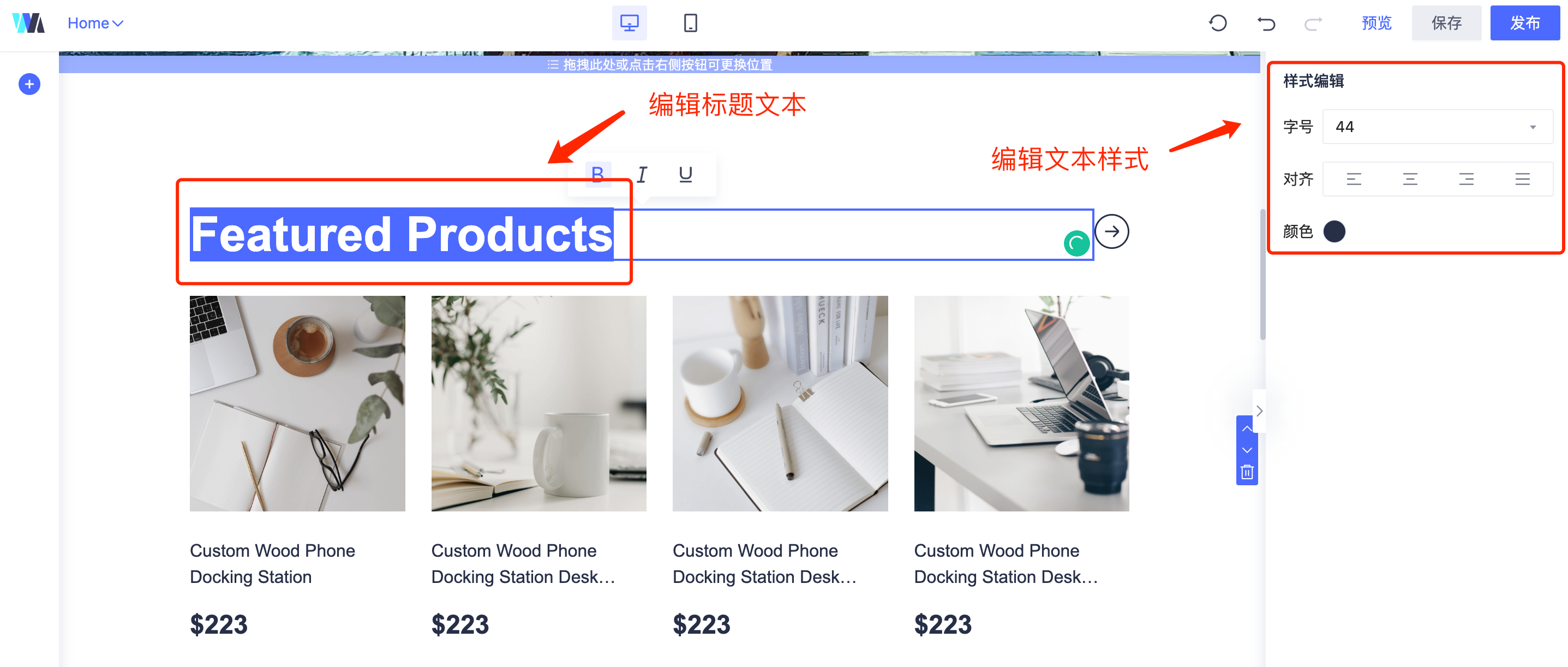 双击标题即可编辑标题文本,在右侧「样式编辑」中可以编辑文本的字号、对齐方式以及字体颜色。