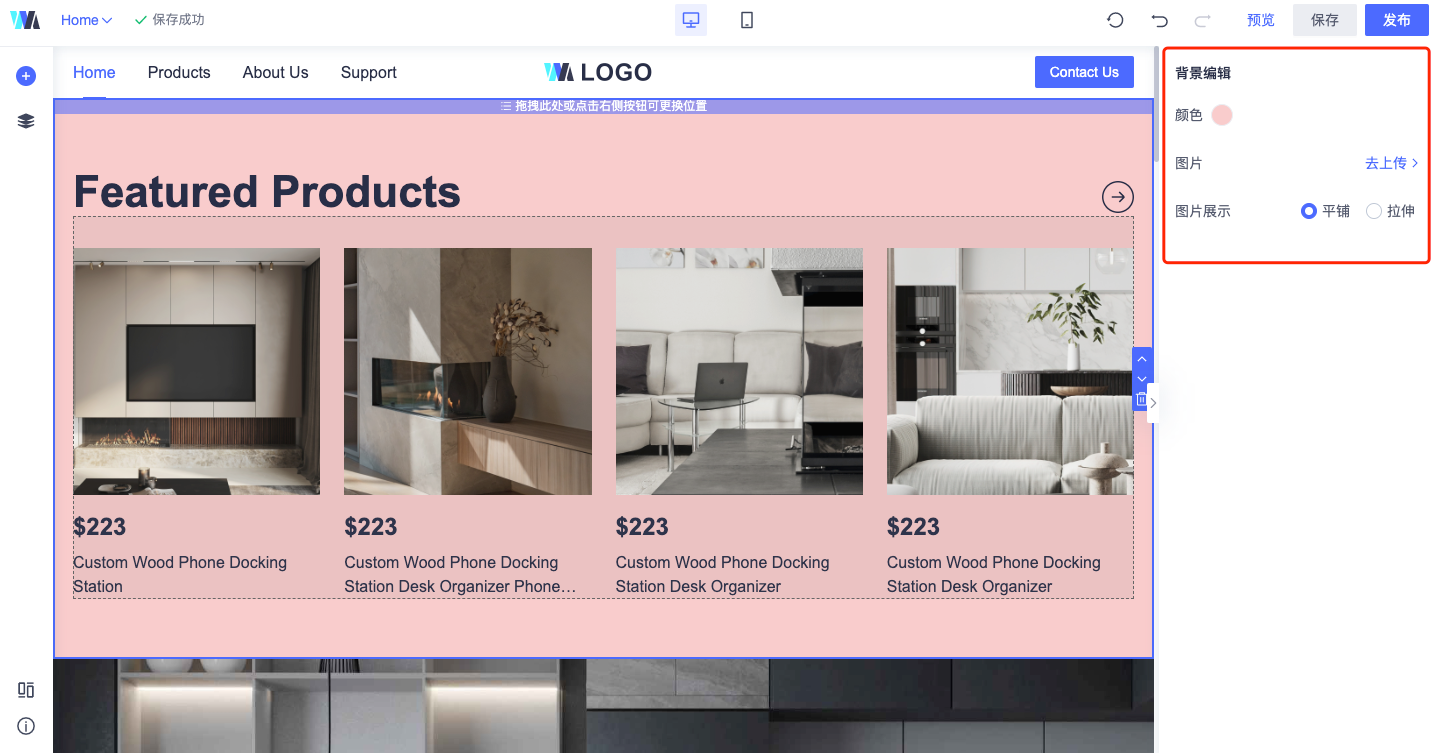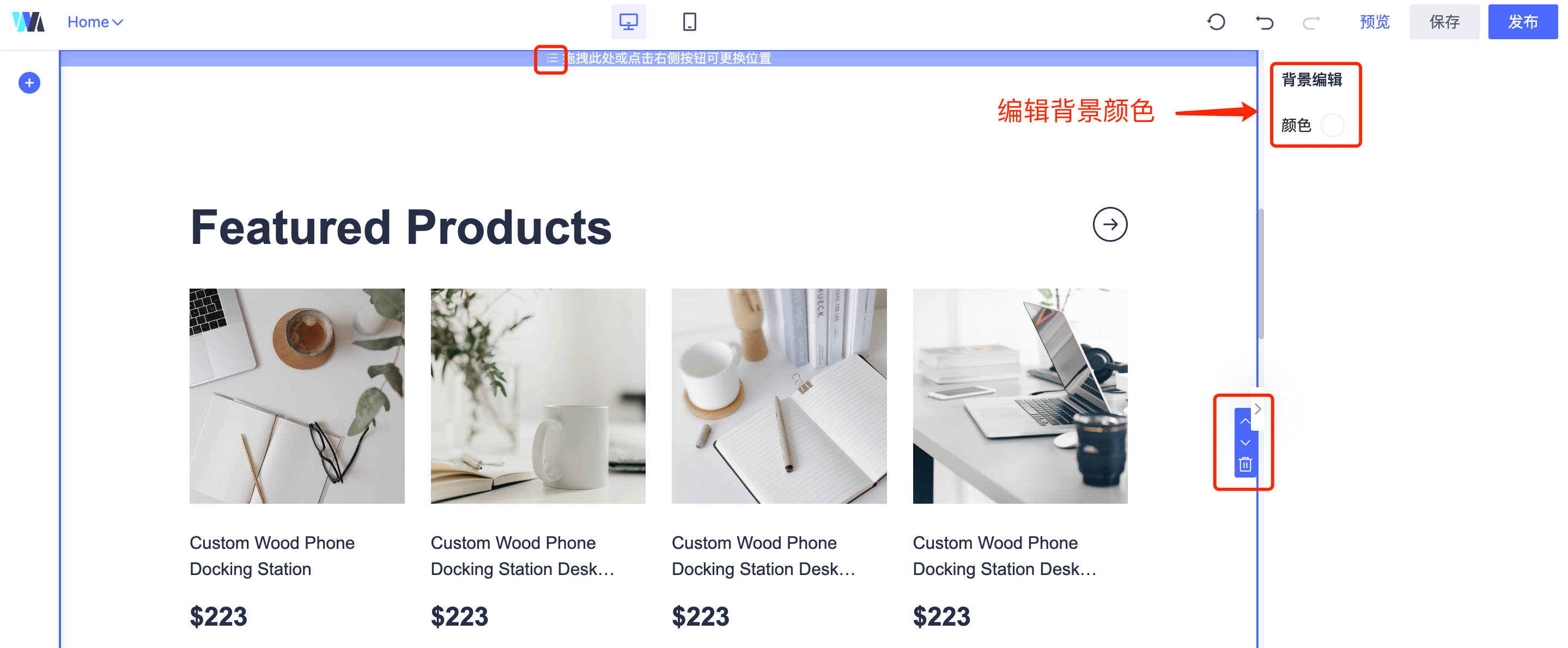 在商品详情页中,单击背景后,也可以实现「拖拽此页」或者将此页「向上/向下移动」。在网站的右上角的「背景编辑」可以编辑想要的背景颜色。