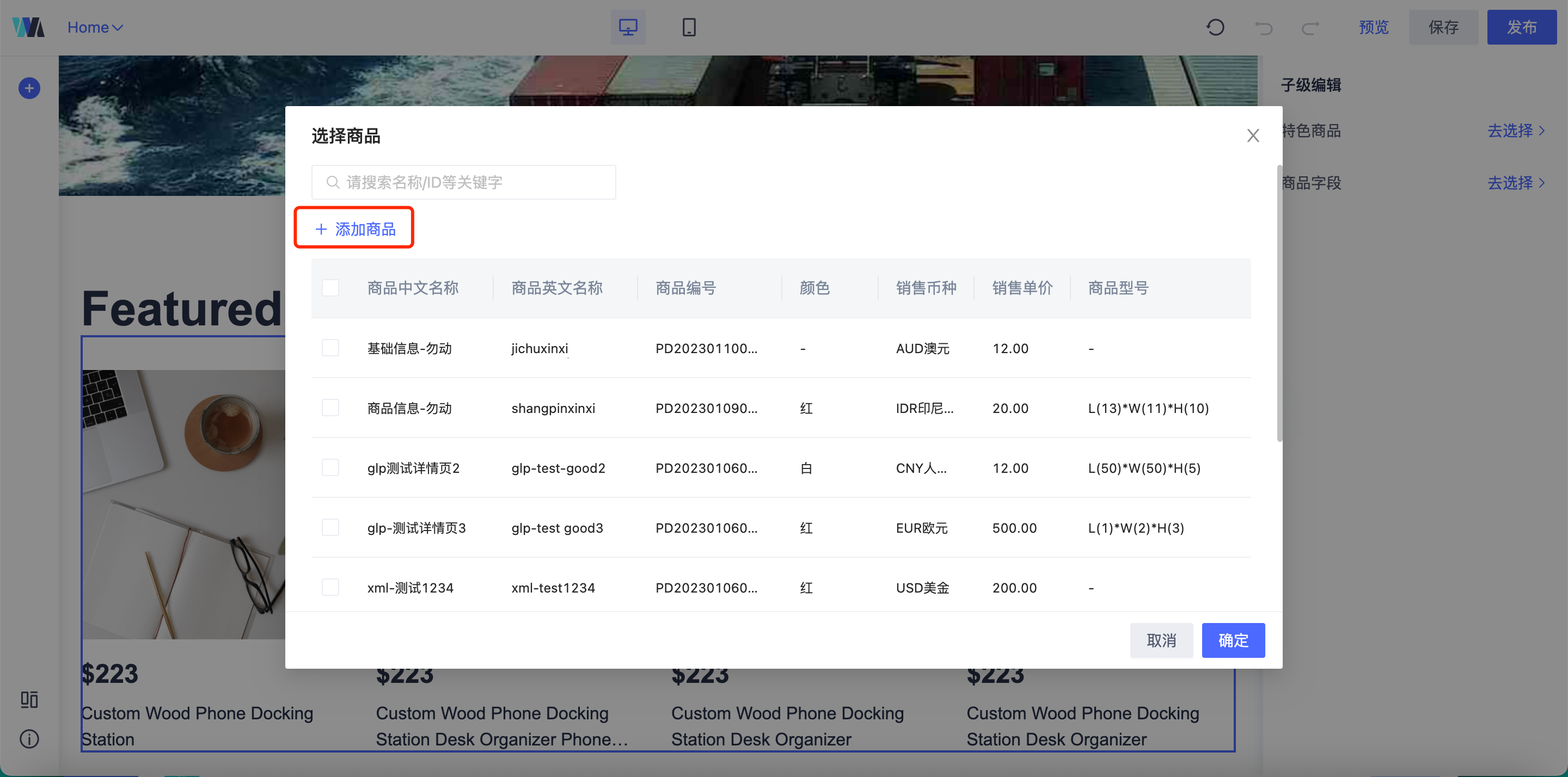 在「子集编辑」中点击「特色产品」后,可以选择「添加产品」或者选中已上传的产品。