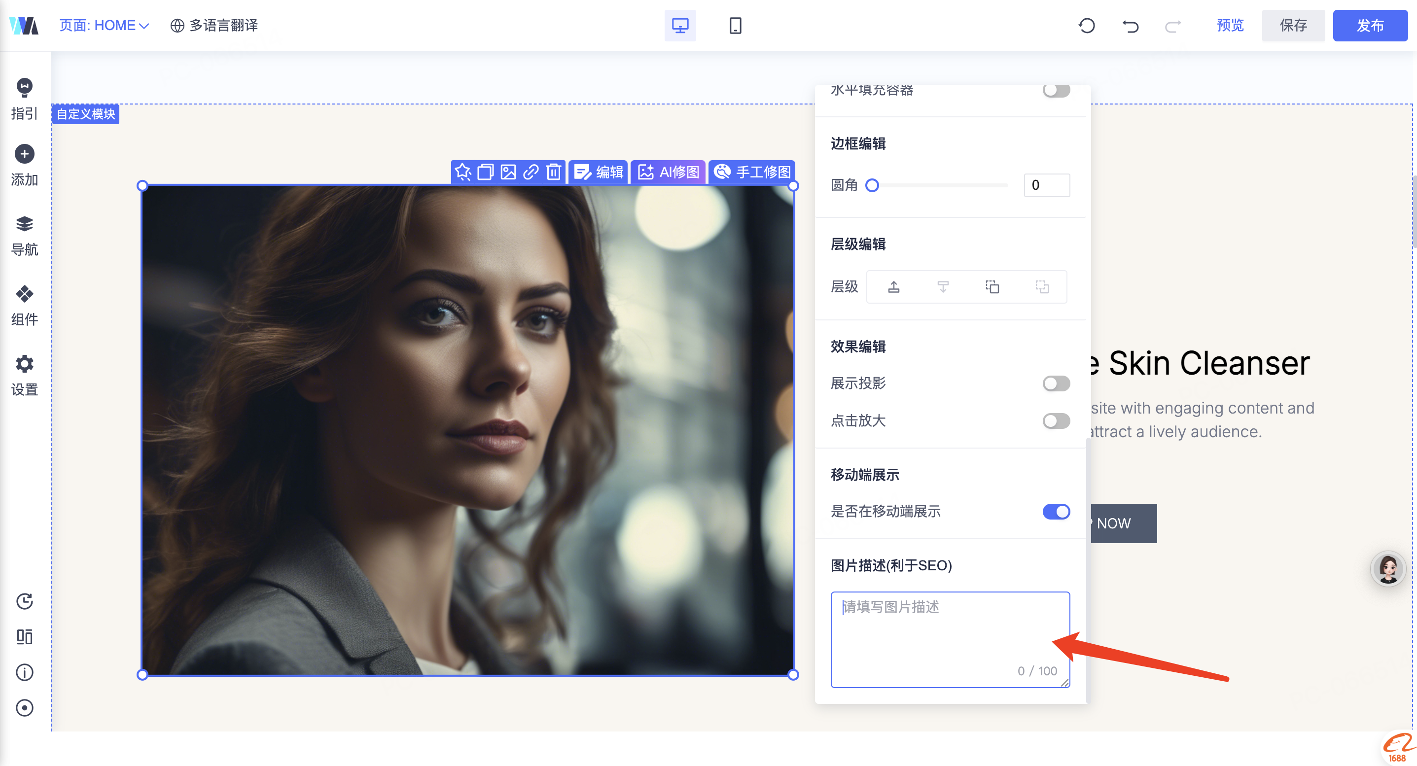 描述:企业介绍,填写的越详细生成的站点描述就越精准。一般可填写企业的亮点、特色和竞争优势,AI会提炼内容在编写企业介绍或商品介绍时重点突出