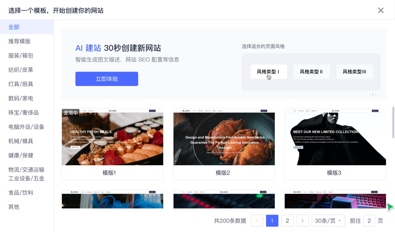 2、在模板选择弹窗上,也可以点击「AI建站-立即体验」的入口进入到AI建站的流程。