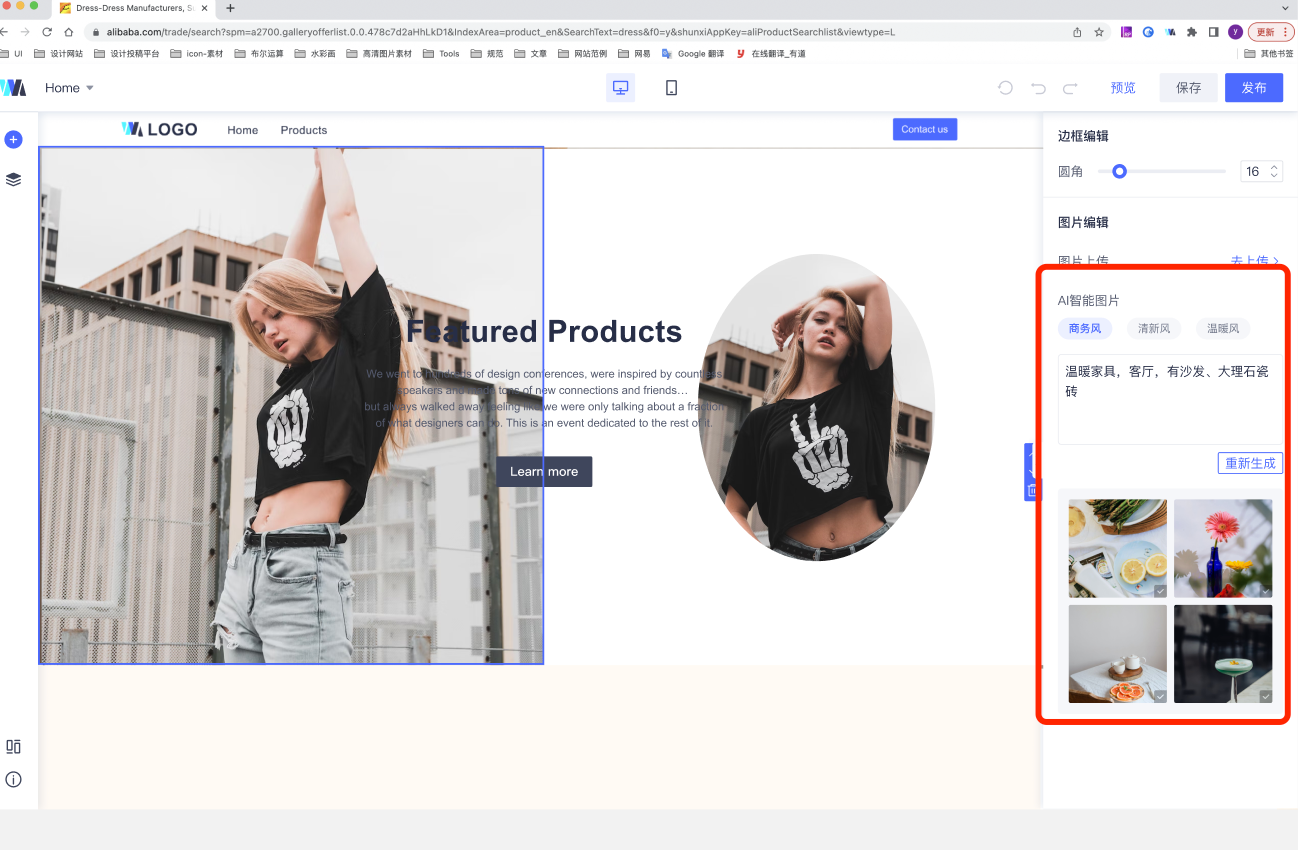 网易外贸通建站支持用AI调整图片和文案。当点击图片时,除了可以在本地上传替换图片之外,也可以使用AI能力,进行快速的图片生成和替换。只要输入对图片的诉求,AI即可按照要求生成4张图片,此时点击满意的图片,即可完成图片的替换。