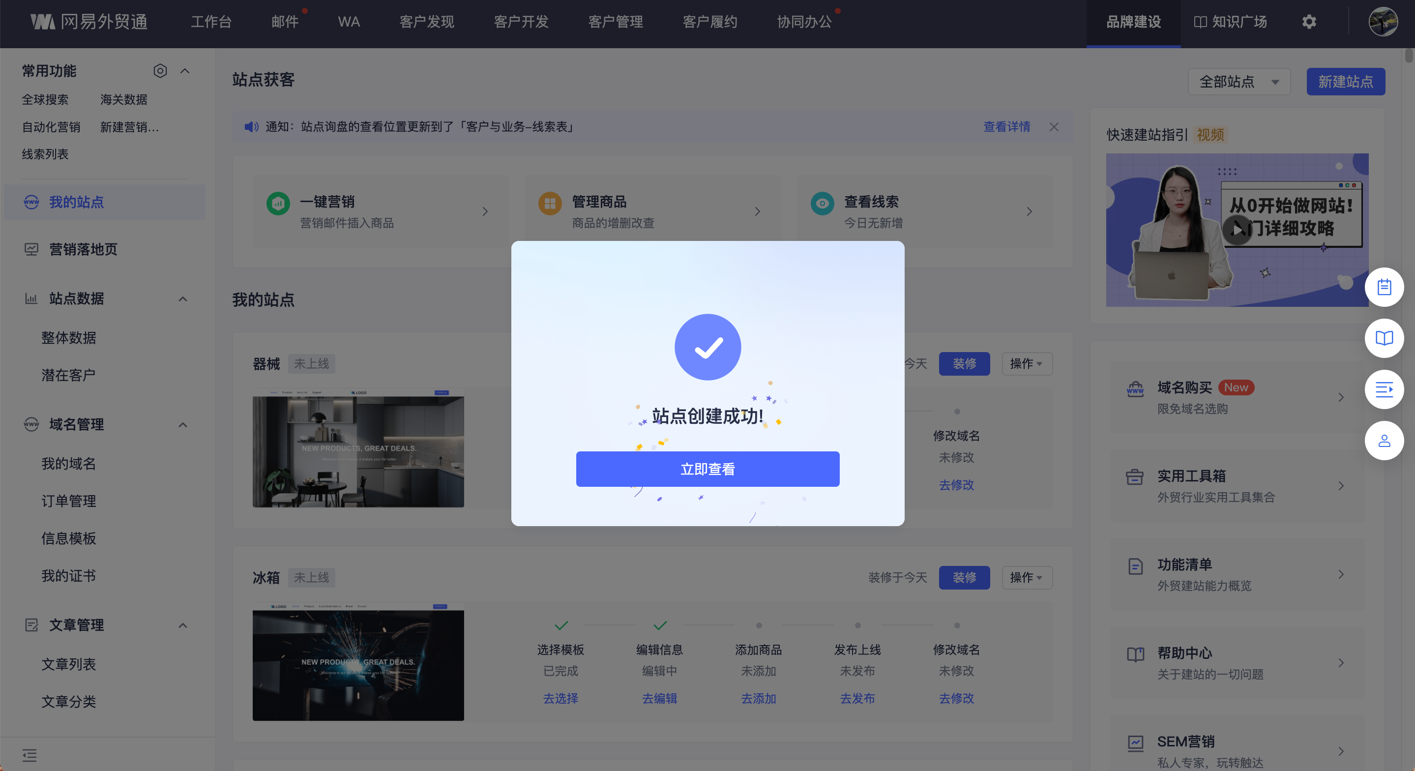 站点创建成功后,即可看到成功弹窗,此时可点击「立即查看」进入到编辑器对生成的图片和文案进行调整。