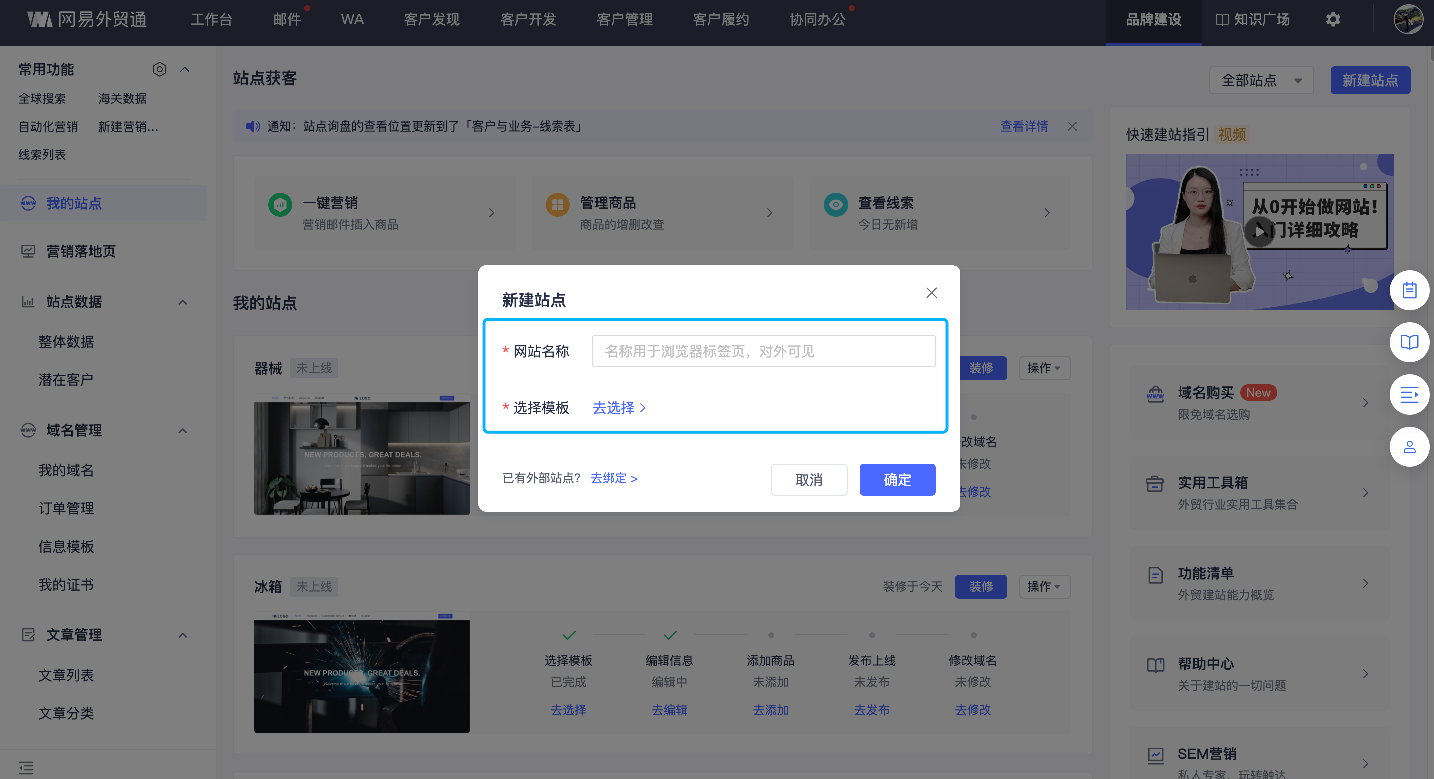 点击右上角「新建站点」,编辑「站点名称」和「选择模板」后,点击「确定」进入官网编辑器「编辑信息」。