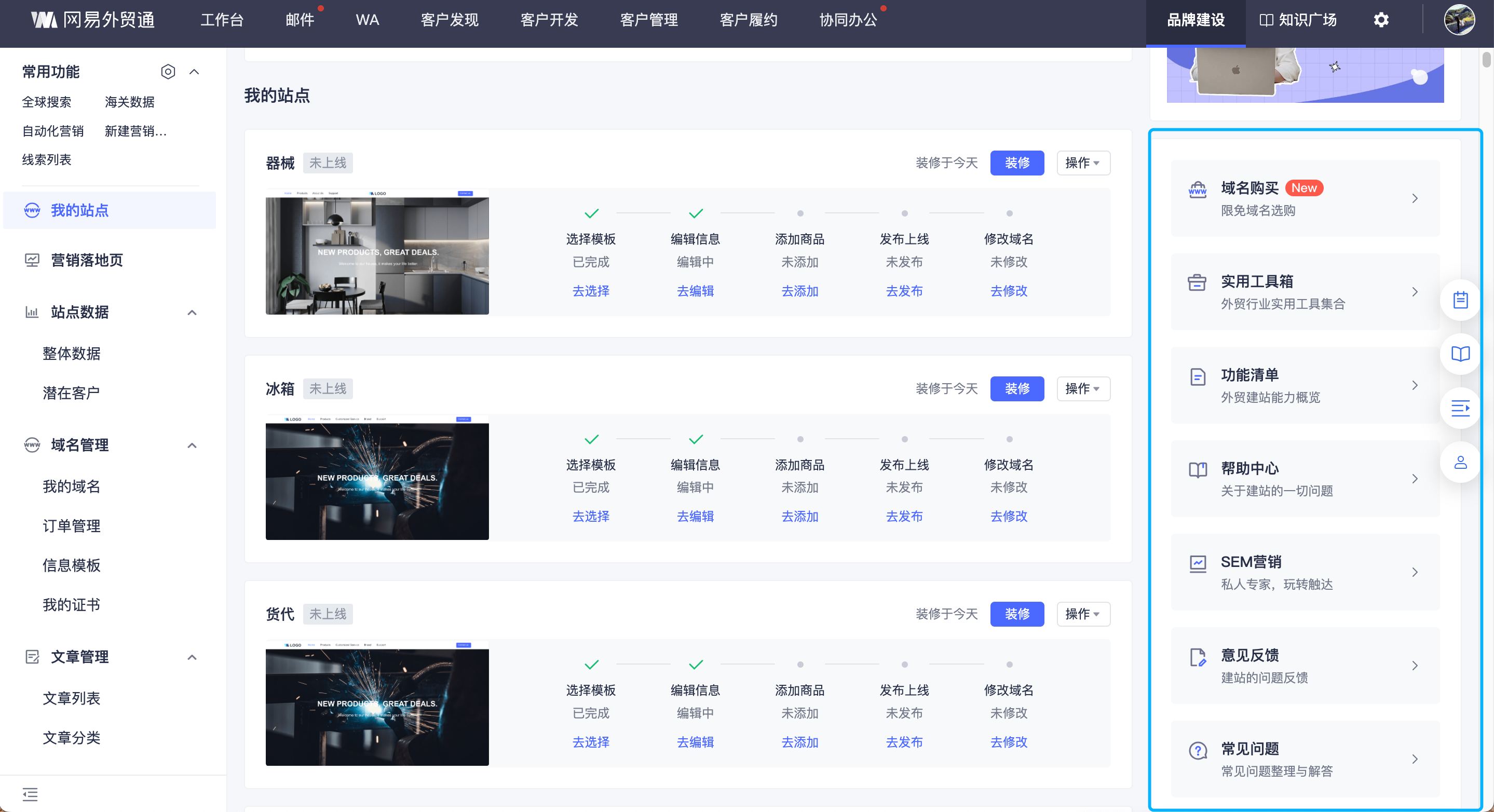 展示信息:站点名称、站点域名、站点状态、上次装修时间、站点首屏截图、站点当天数据(日期、浏览数、留资客户数、以及他们的同比率和留资率)