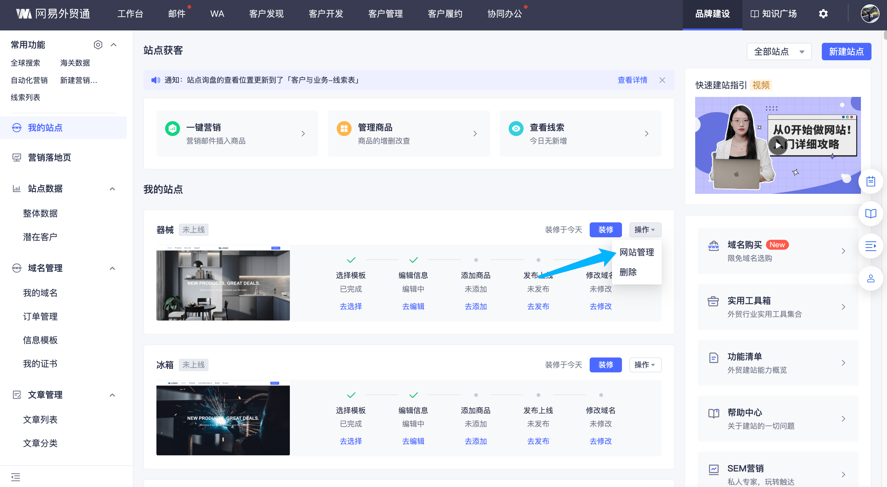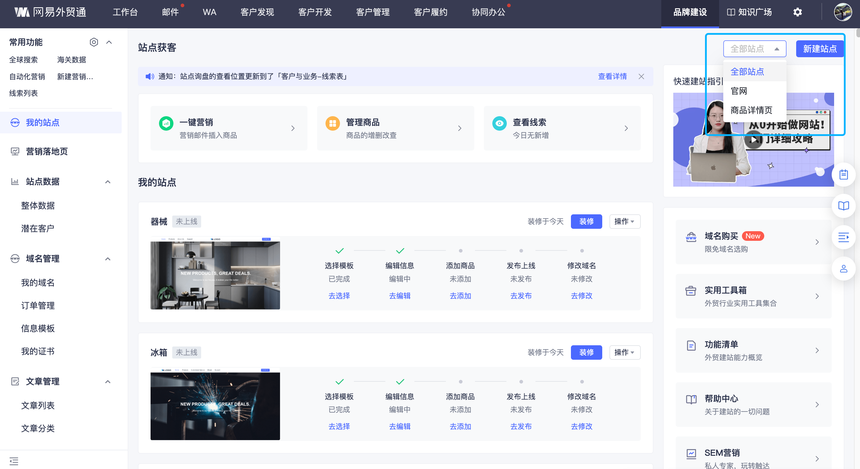 点击「站点管理」模块后选择「我的站点」,首页支持多站点管理,每个站点结合数据以卡片形式展现
