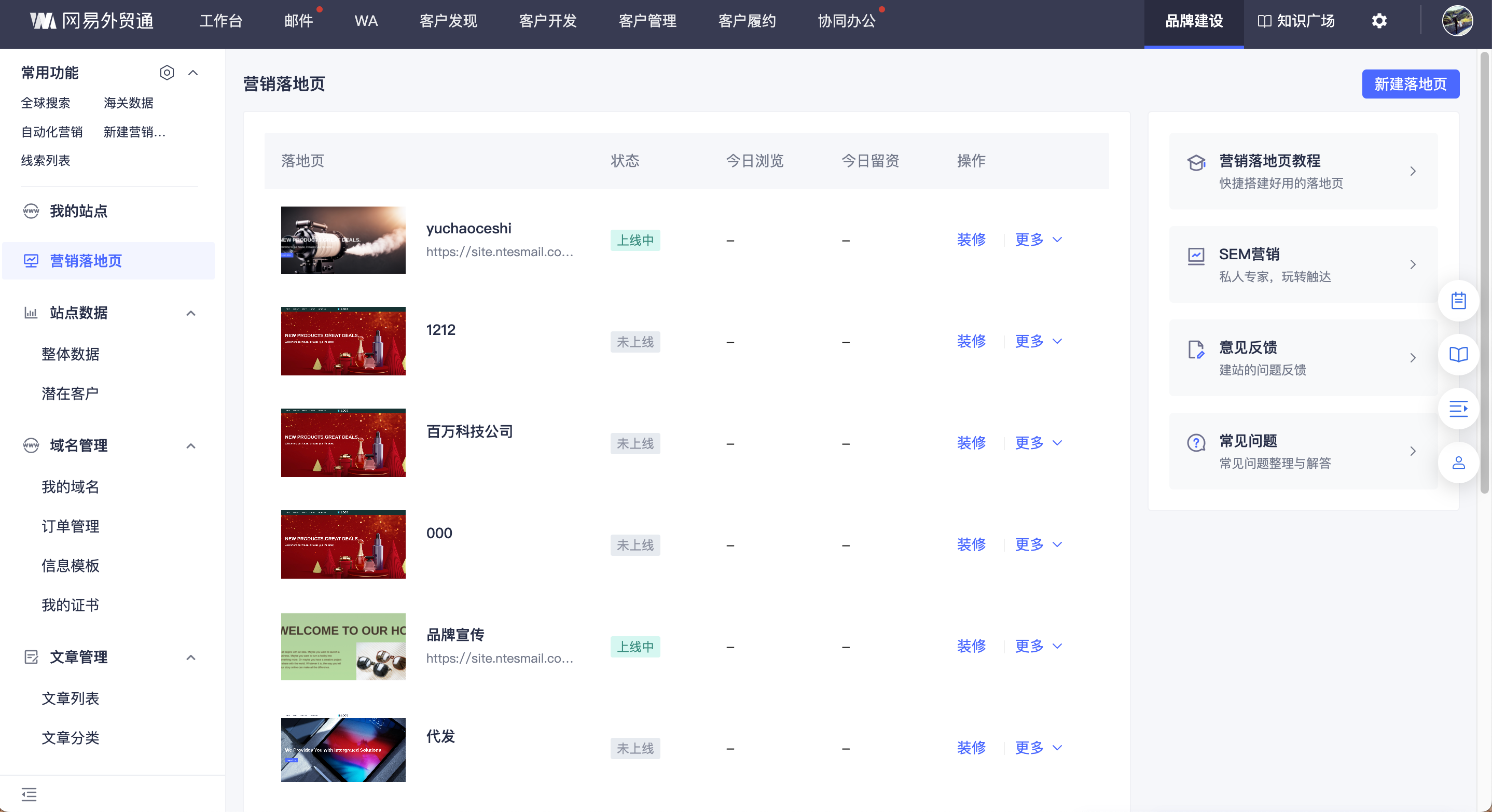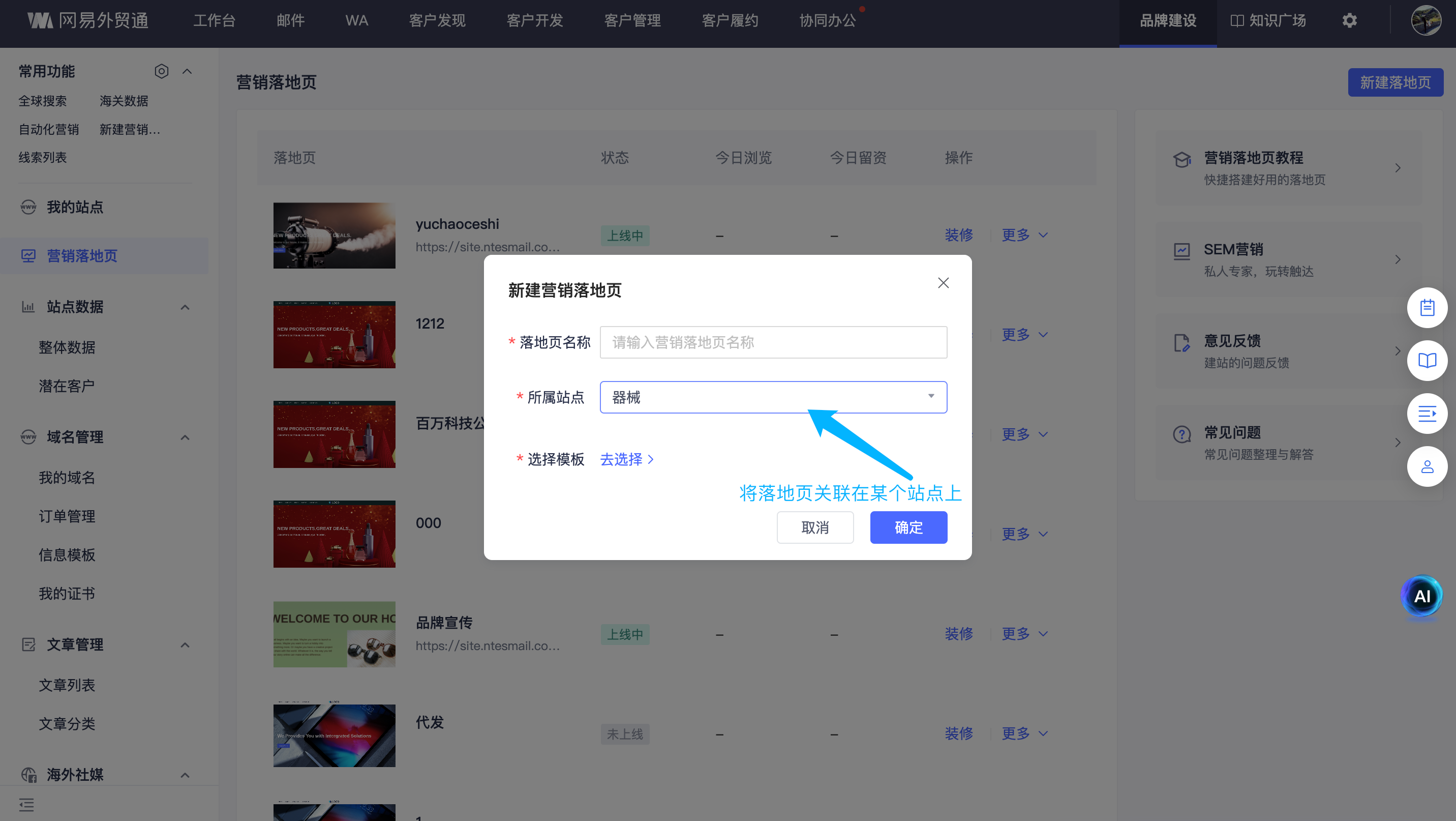 入口1:在顶部目录的「站点管理」中,点击「营销落地页」