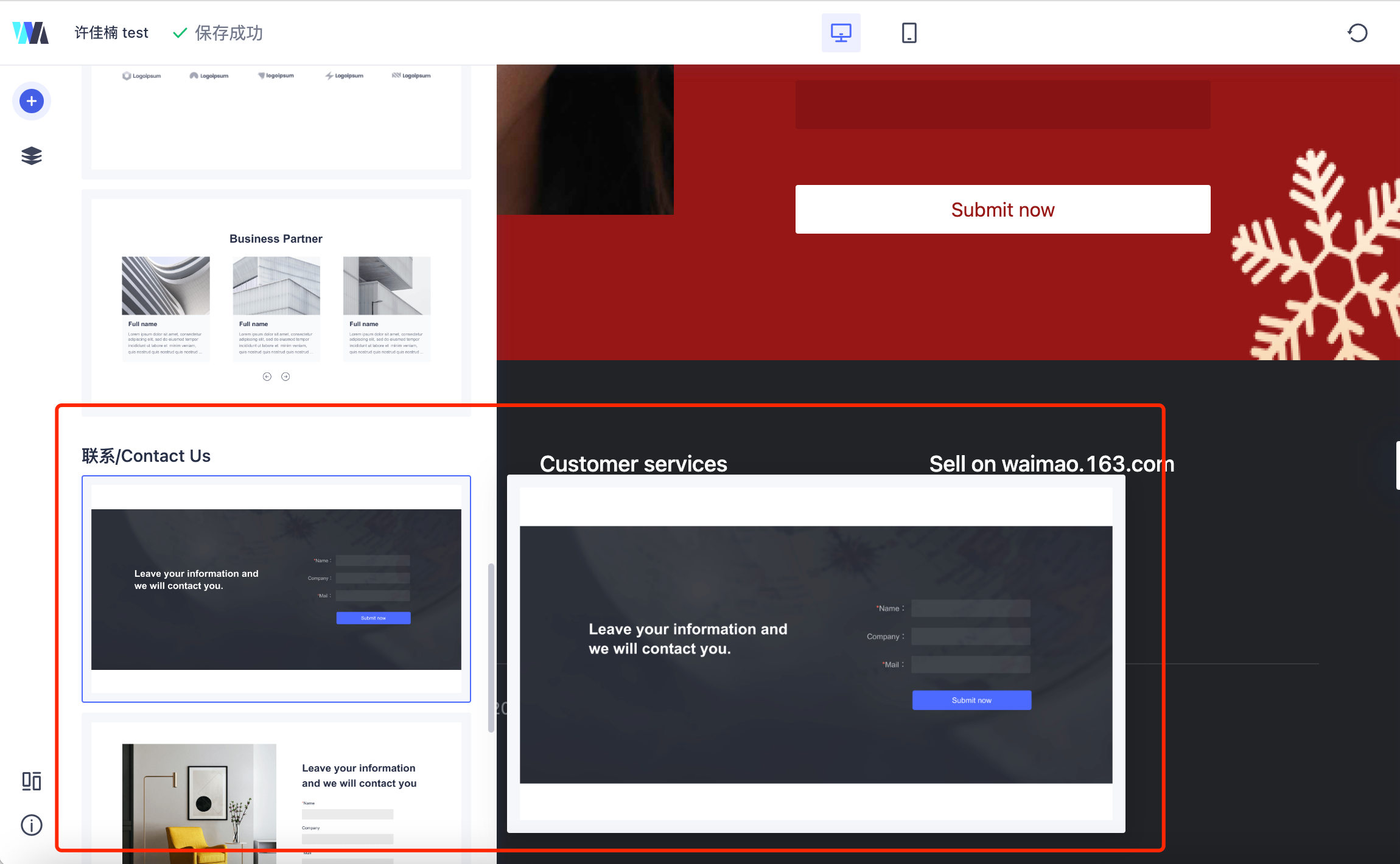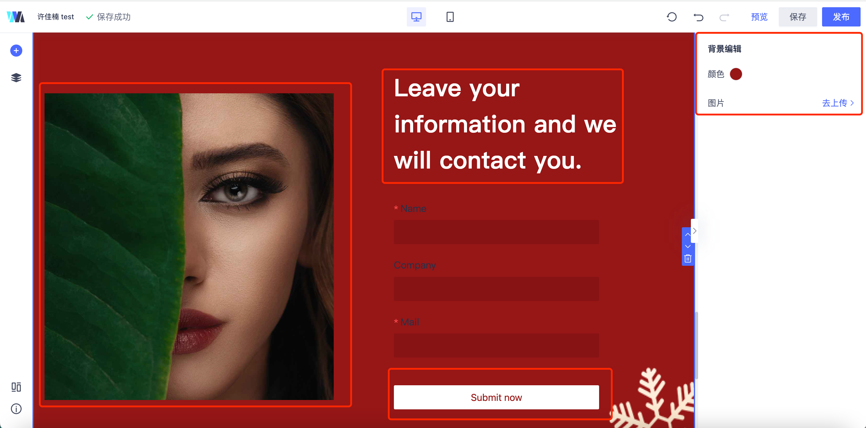 - 在【Contact Us】中,单击图片时,可以进行图片上传,在右侧元素编辑栏可以进行背景编辑: