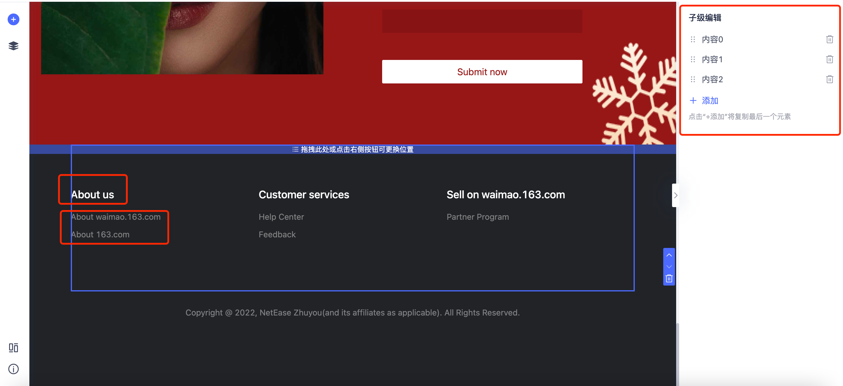 在【Footer】中点击模块背景时,在右侧元素编辑栏可以进行子级编辑: