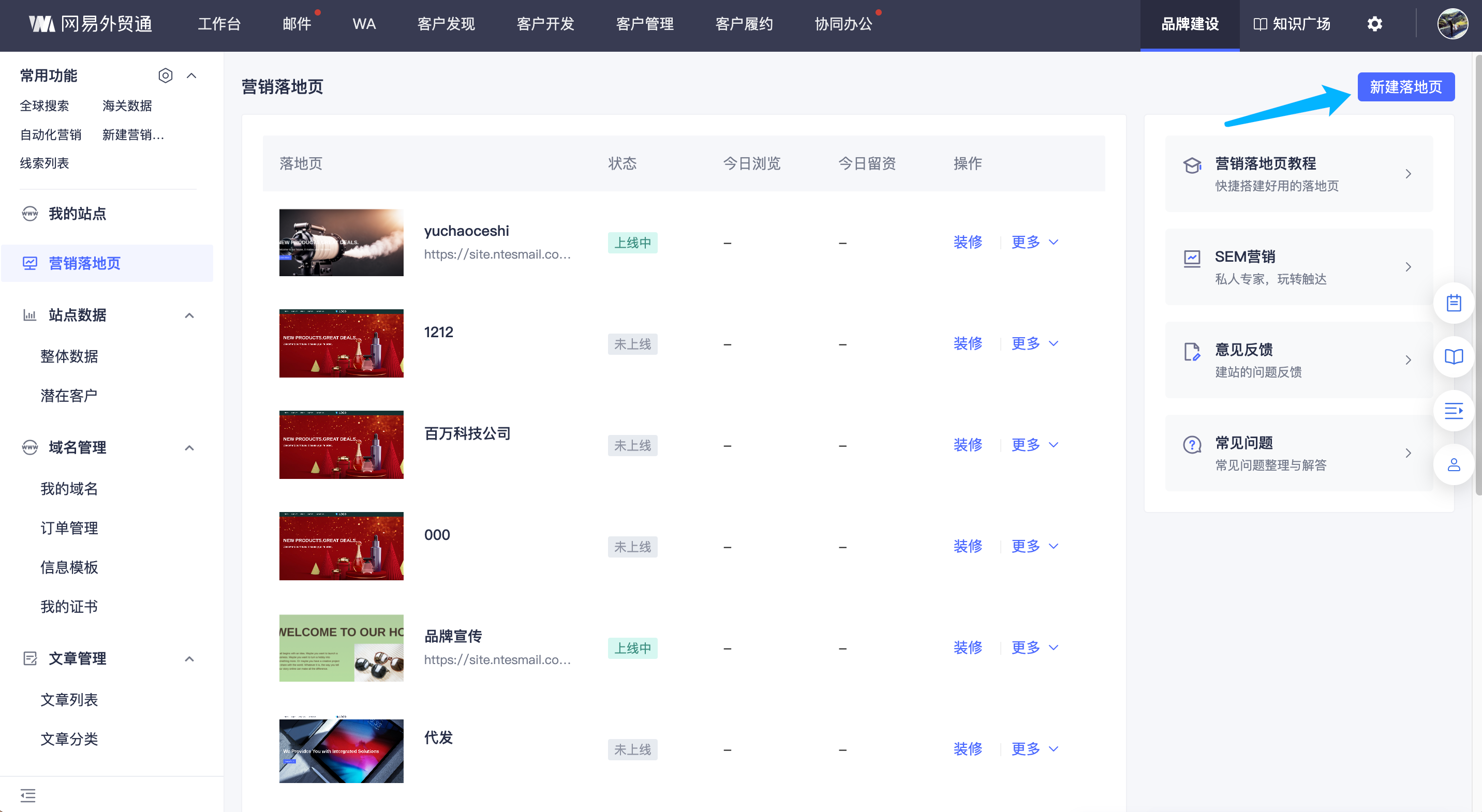 - 在右上方点击「新建落地页」即可开始搭建营销落地页。