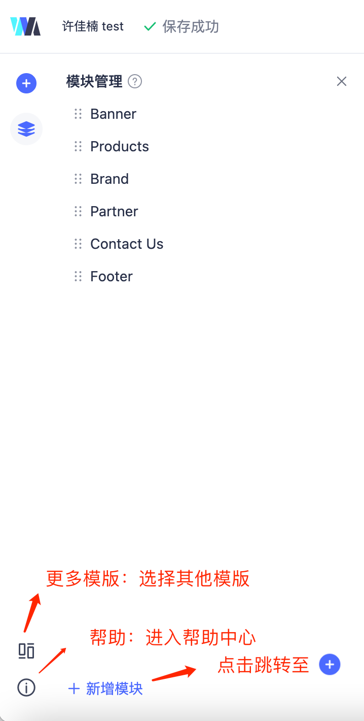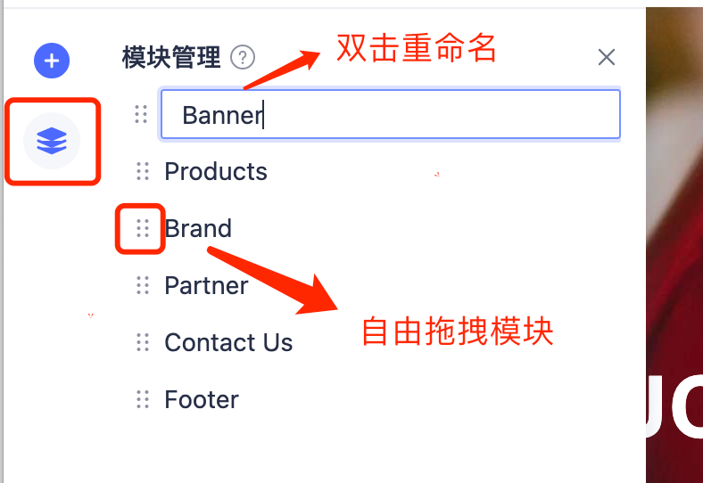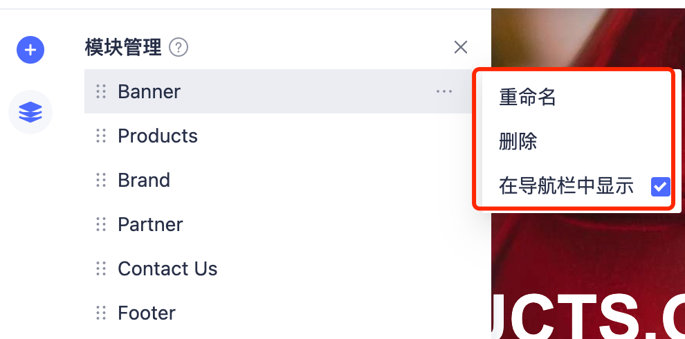 - 在左侧导航栏的「模块管理」中,可自由拖拽,改变模块顺序,且改动会自动同步至顶端导航栏