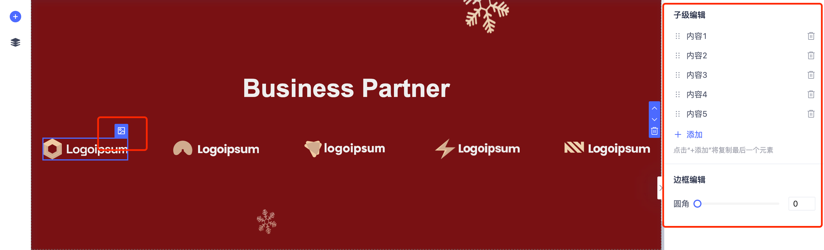 单击图标时,可以上传图标图片,在右侧元素编辑栏可以进行子级编辑&边框: