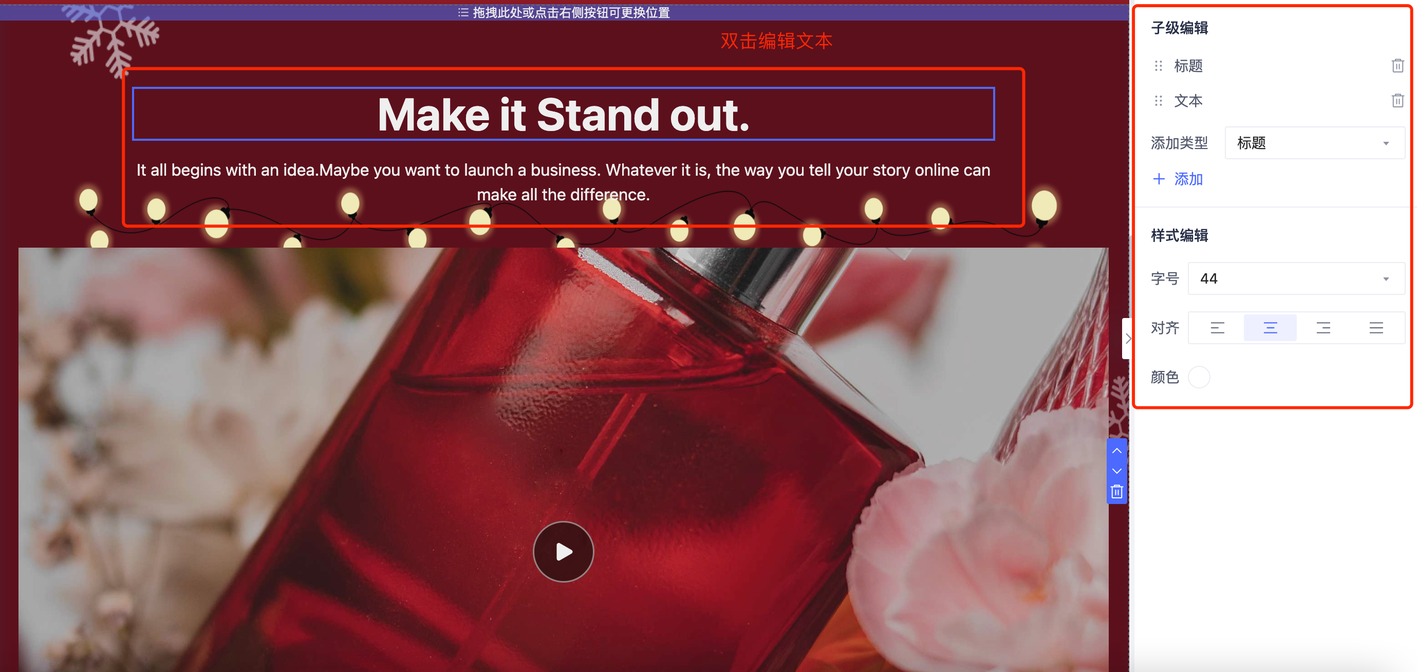 - 单击文本时,在右侧元素编辑栏可以进行子级编辑&样式编辑: