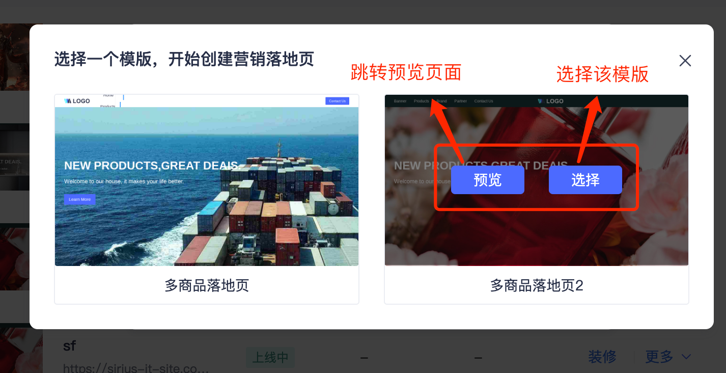 - 点击「去选择」后,在模板列表中可以选择点击,1「预览」模板 或者 2「选择」。
