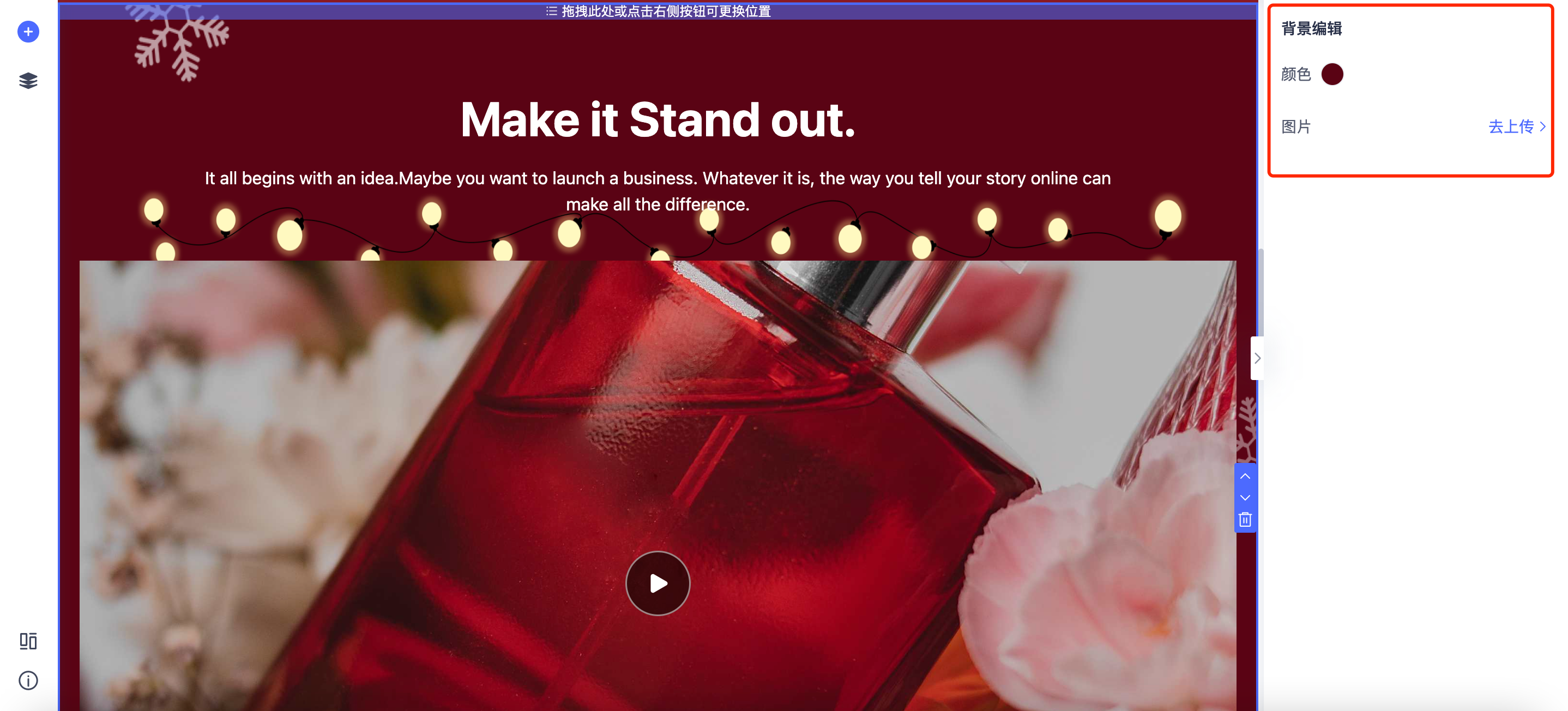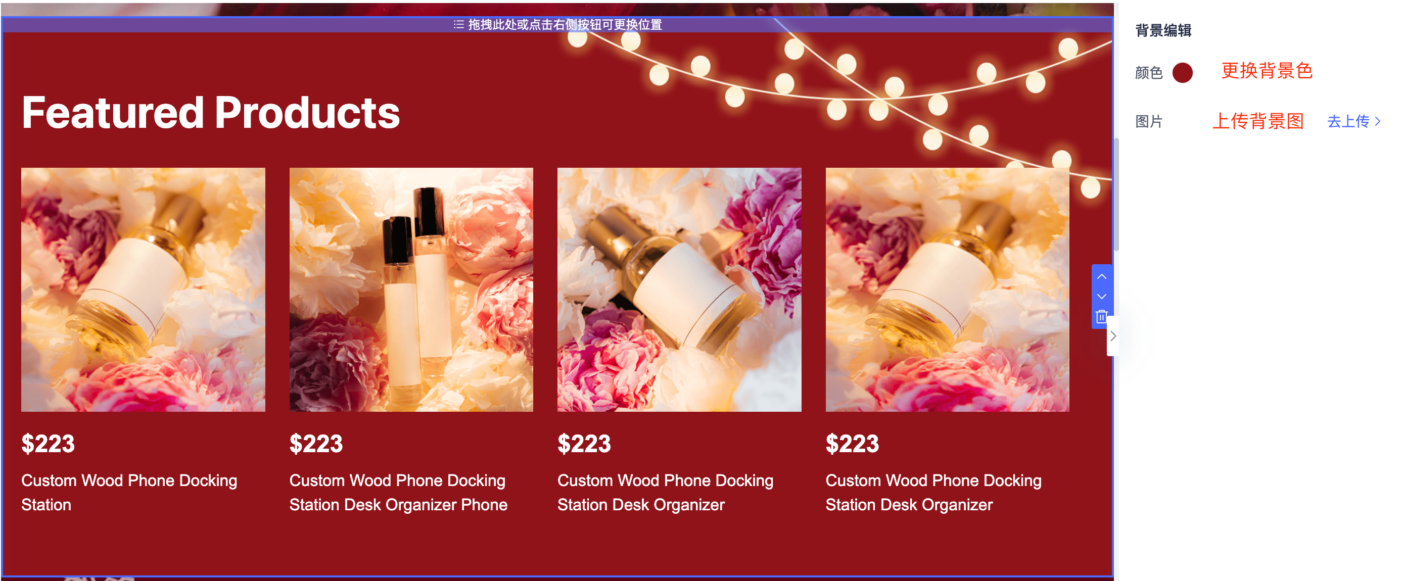 - 单击【Product】模块背景后,在右侧元素编辑栏中可以进行背景编辑: