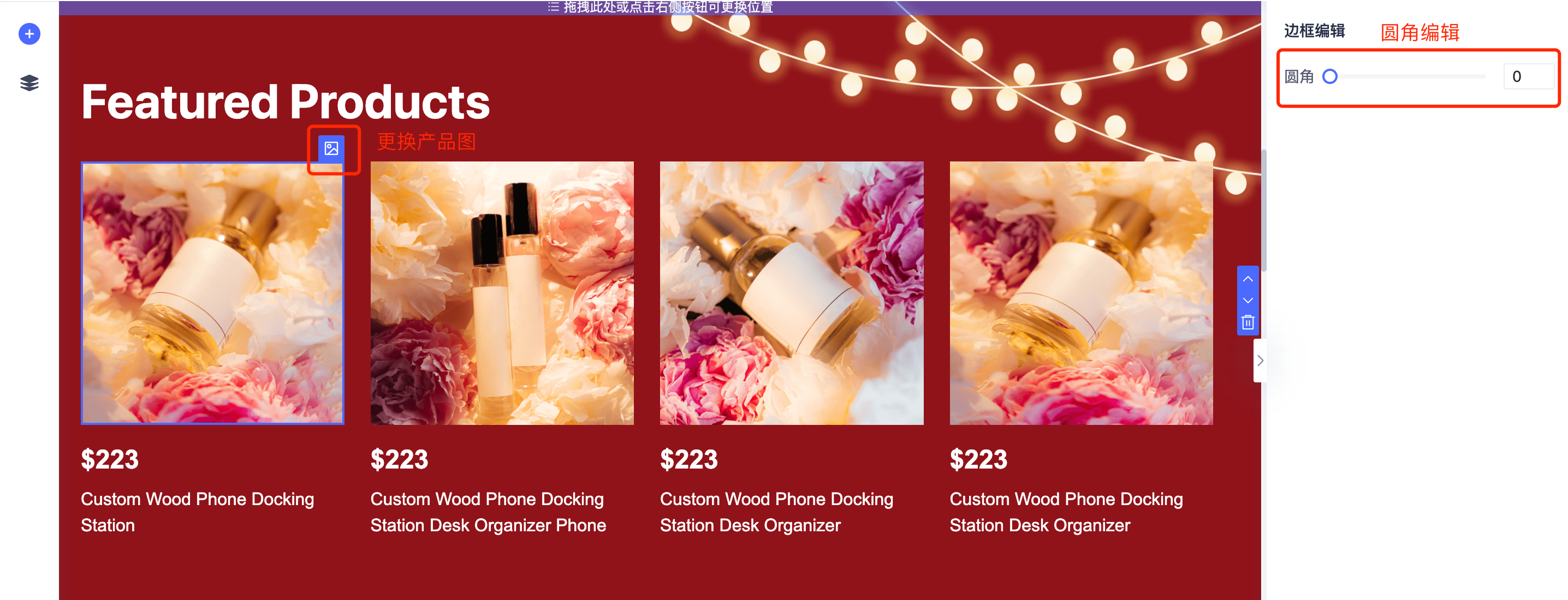- 单击产品图时,可以上传新的产品图;在右侧元素编辑栏中可以进行边框编辑: