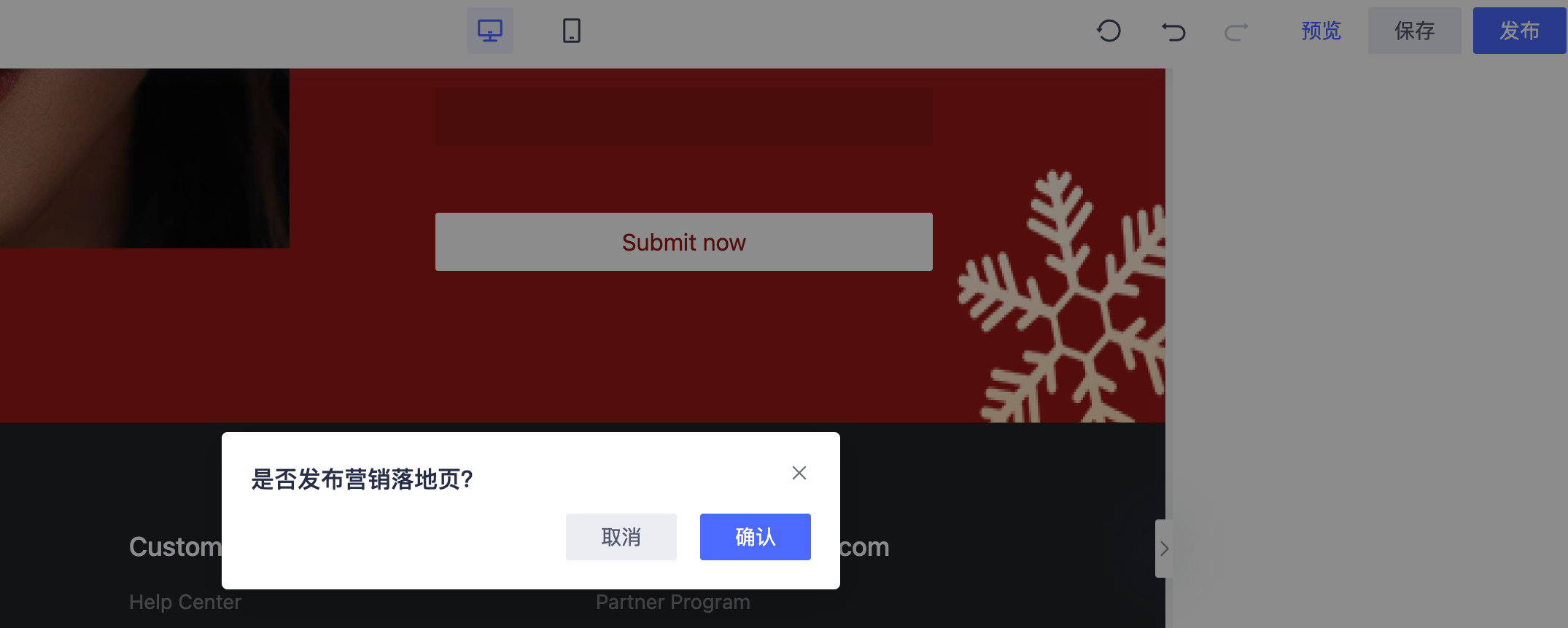 - 点击「确定」后,跳转进入编辑器,对落地页进行编辑并发布。
