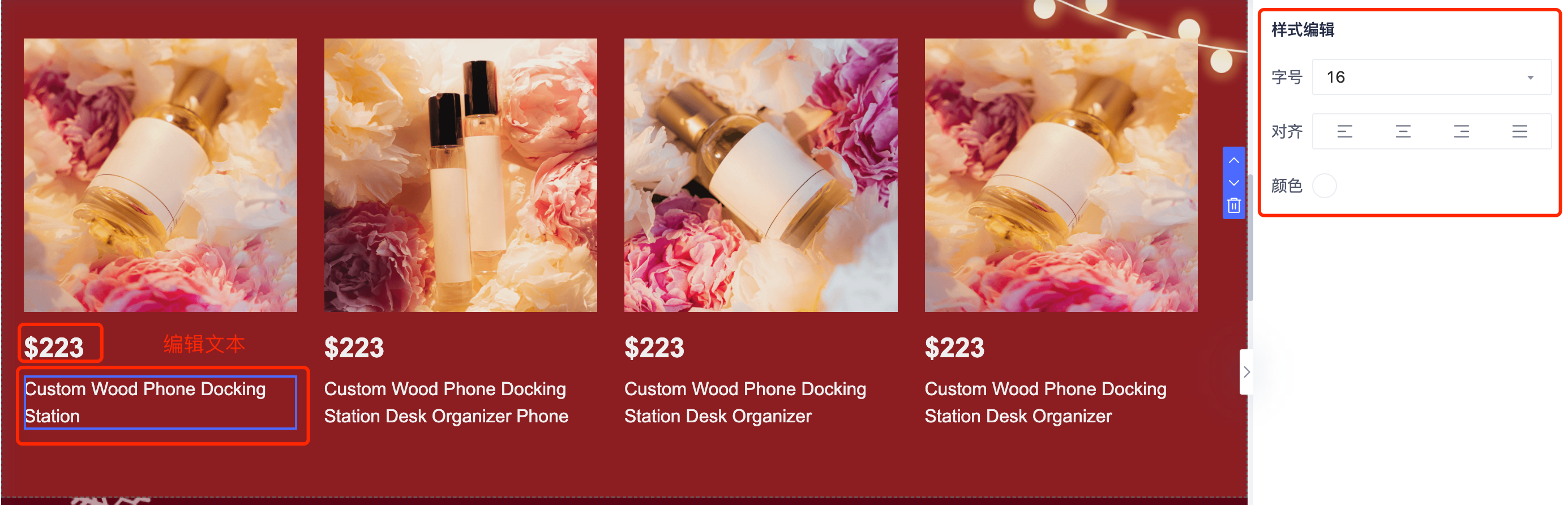 - 单击产品图下方文本时,在右侧元素编辑栏中,可以进行样式编辑: