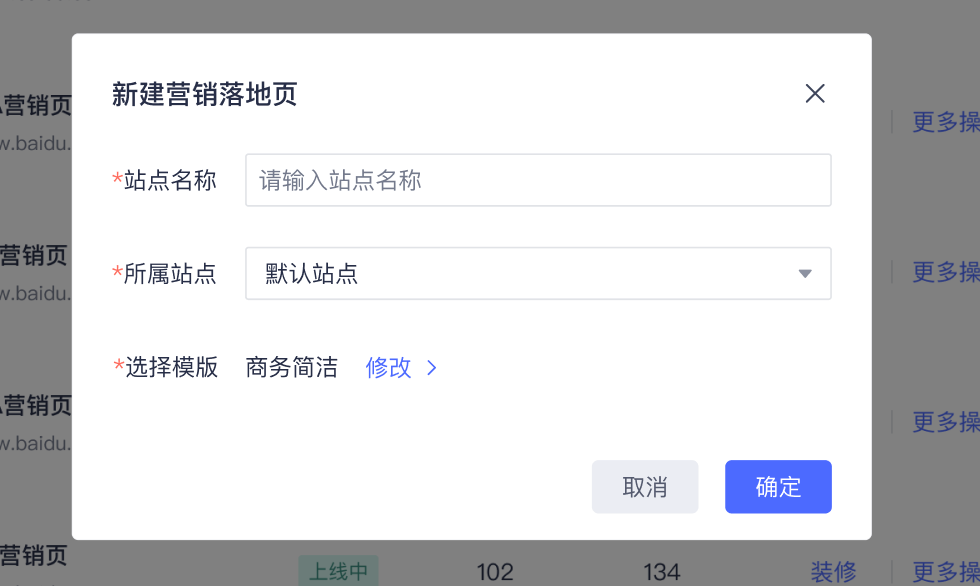 「所属站点」:在下拉选项框中选择该新建落地页所属的站点,1默认站点*、2将落地页挂落在其中一个已有站点下(不再展示默认站点)。