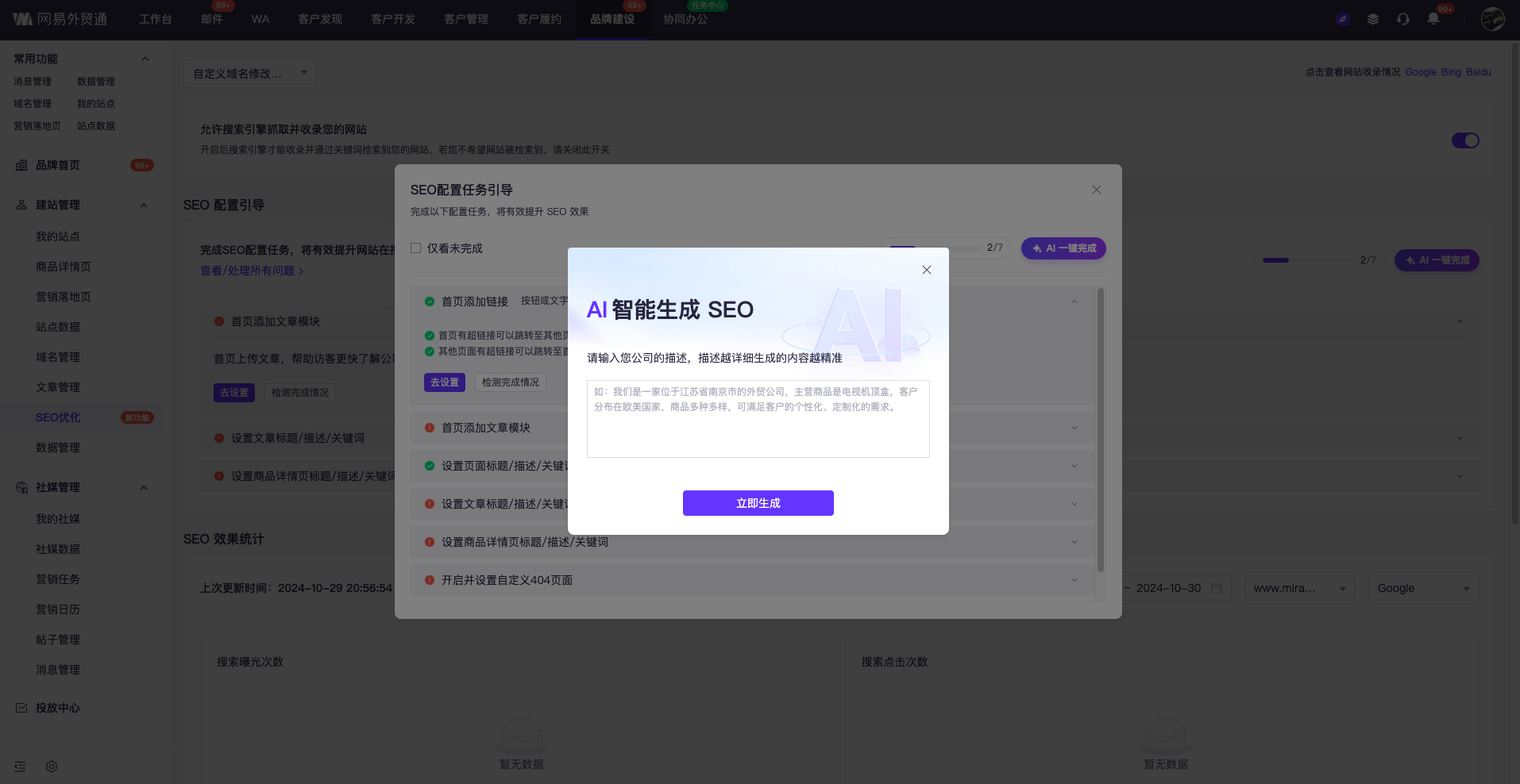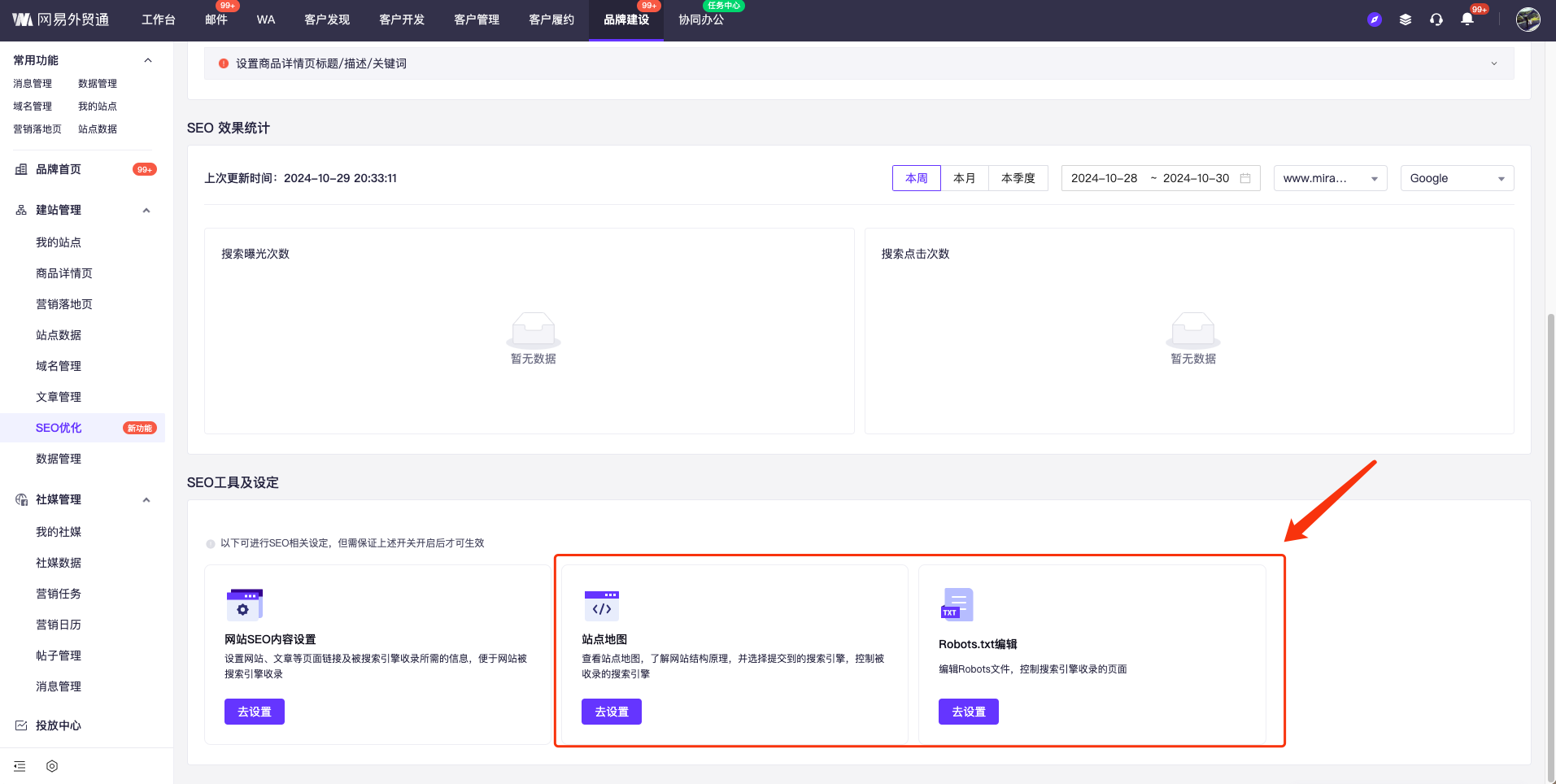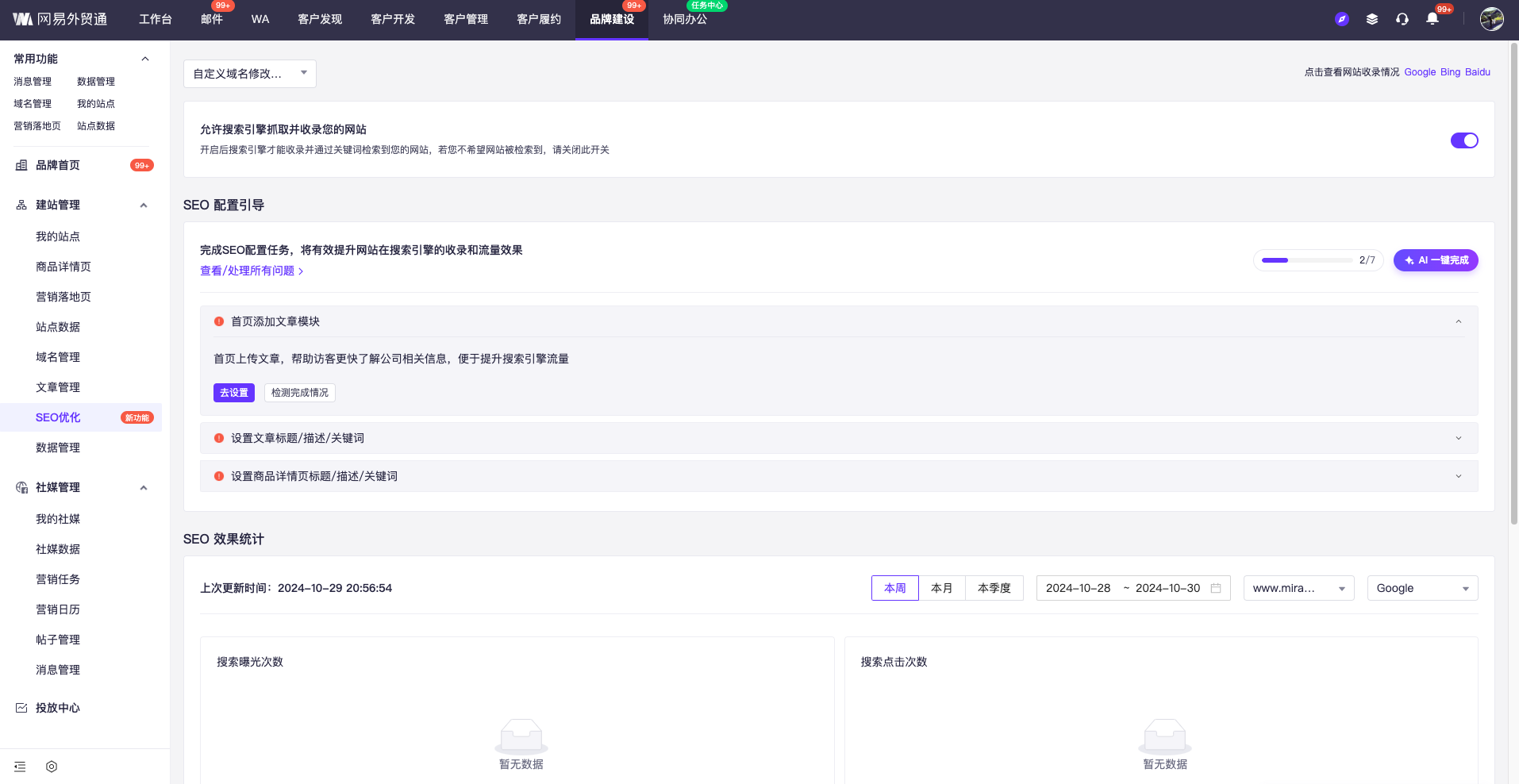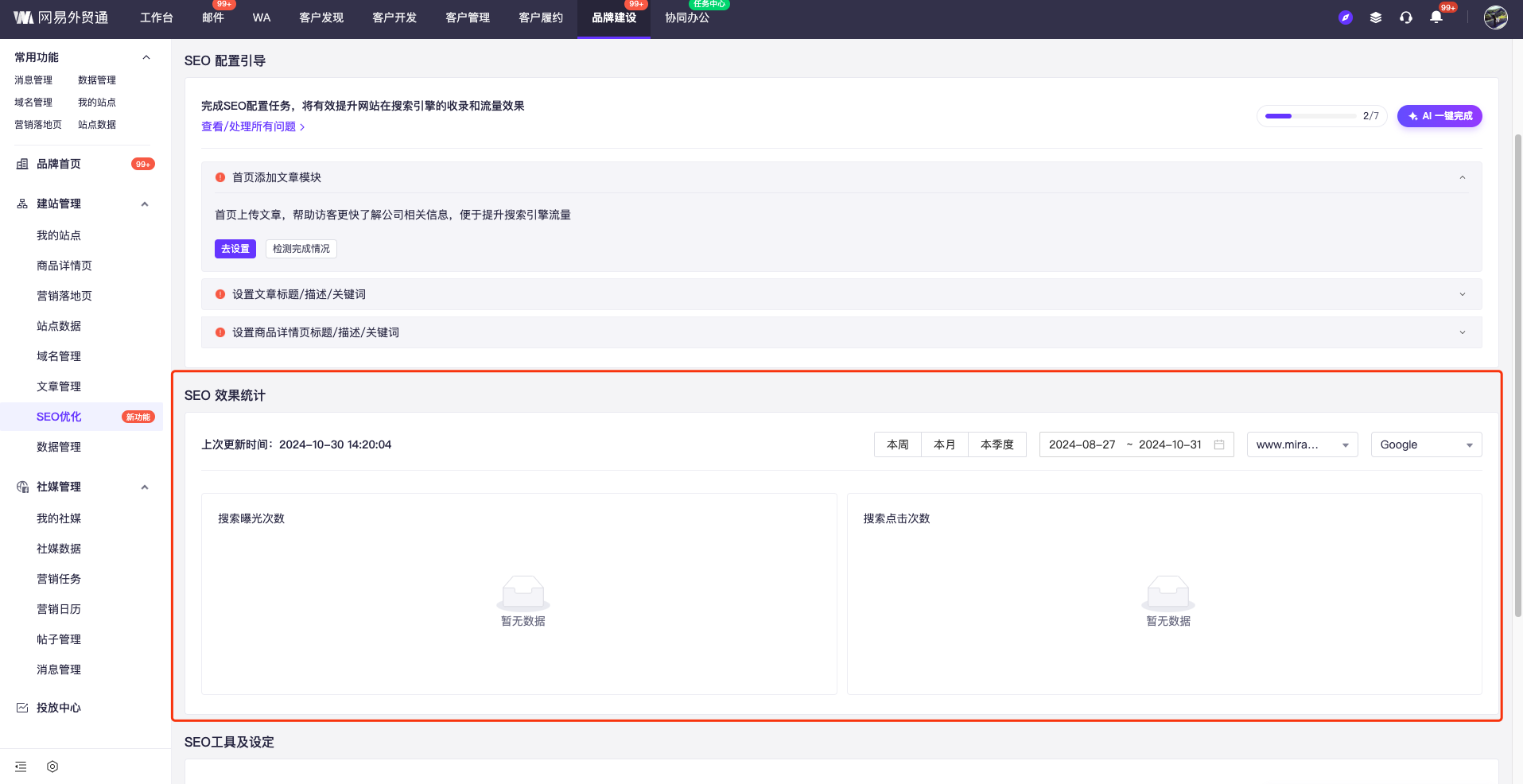外贸通提供SEO优化所需的基础配置及效果查看能力,暂不提供复杂的关键词研究、外链建设、人工SEO等高阶服务。