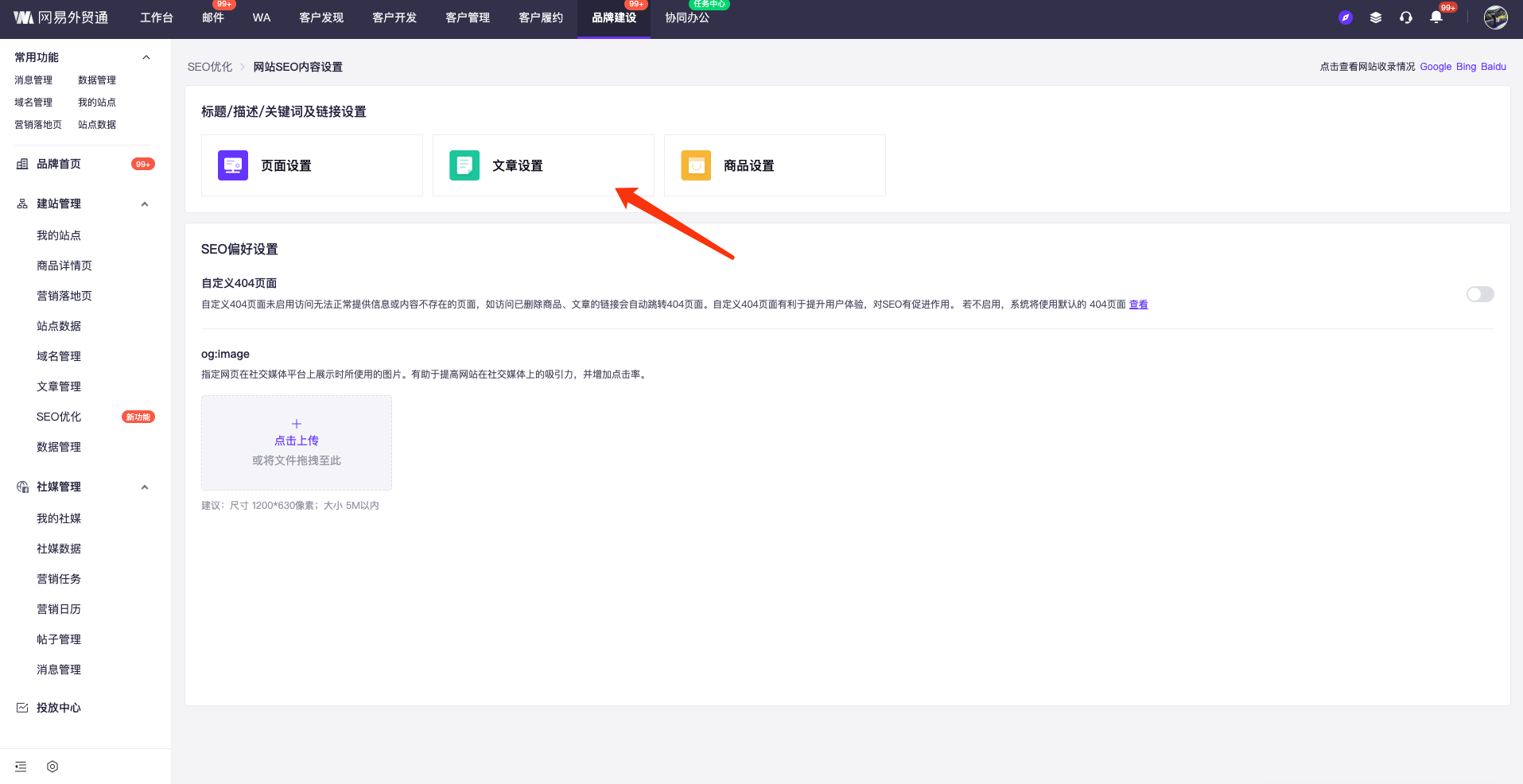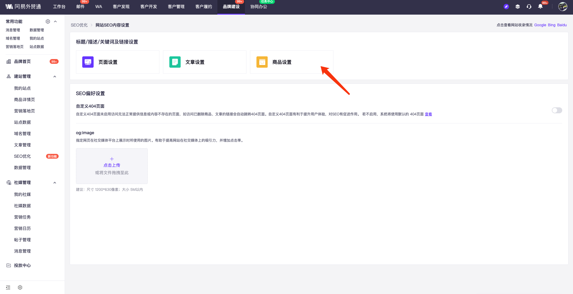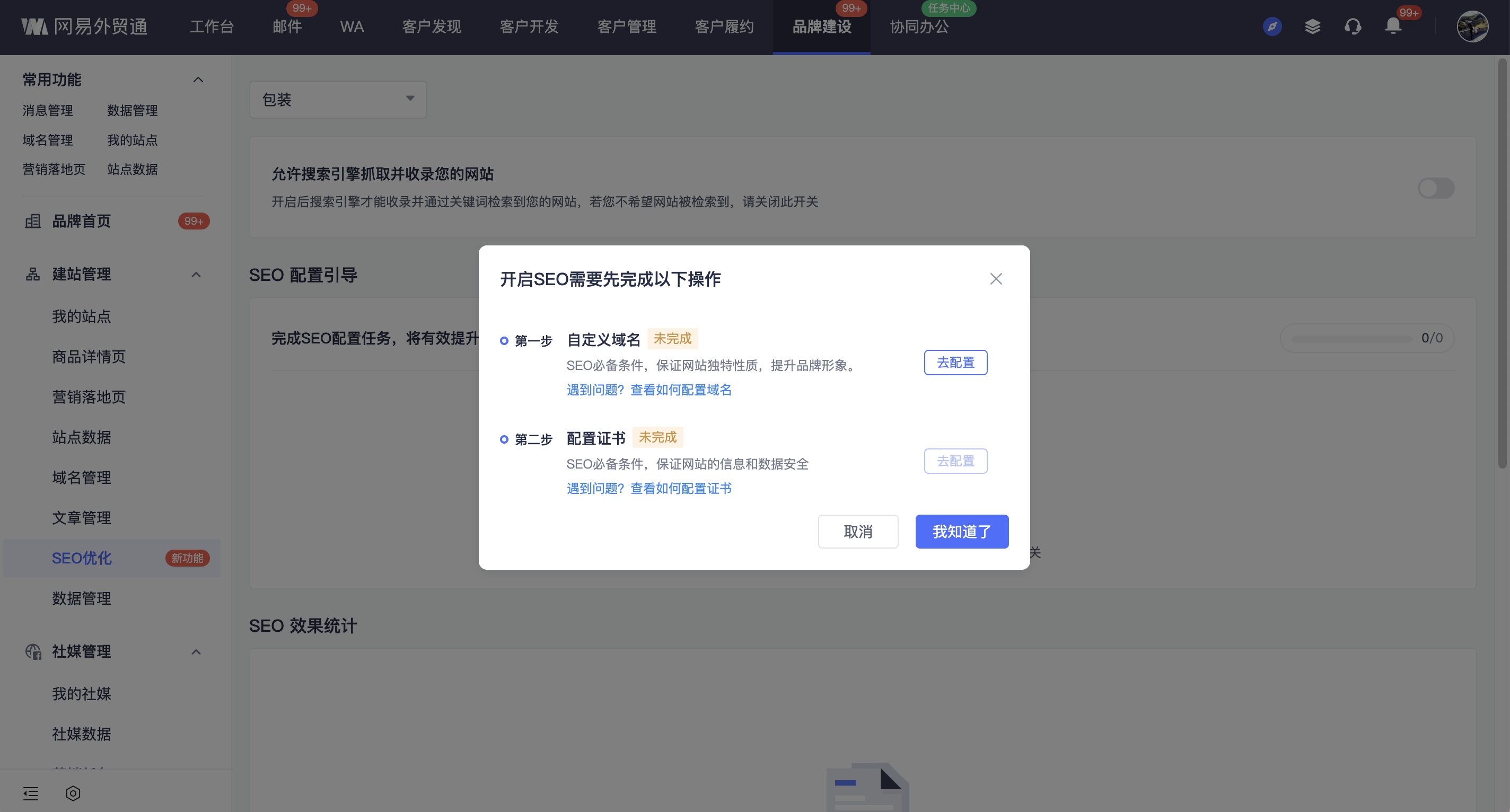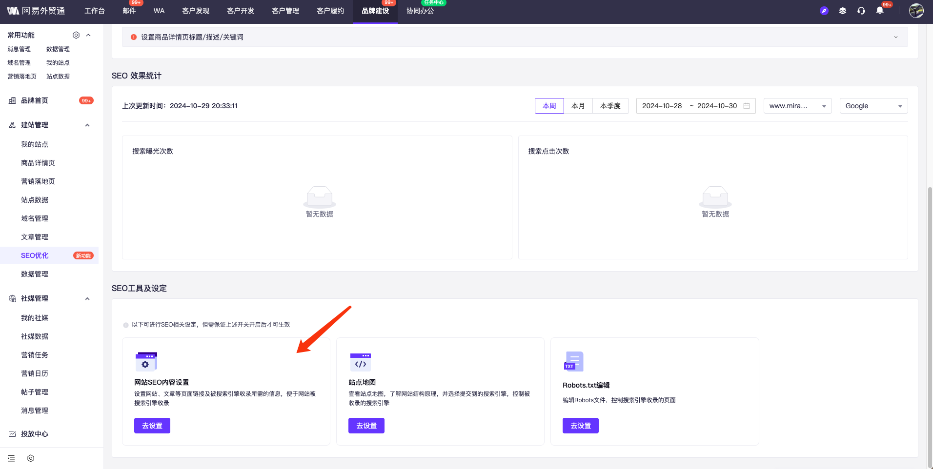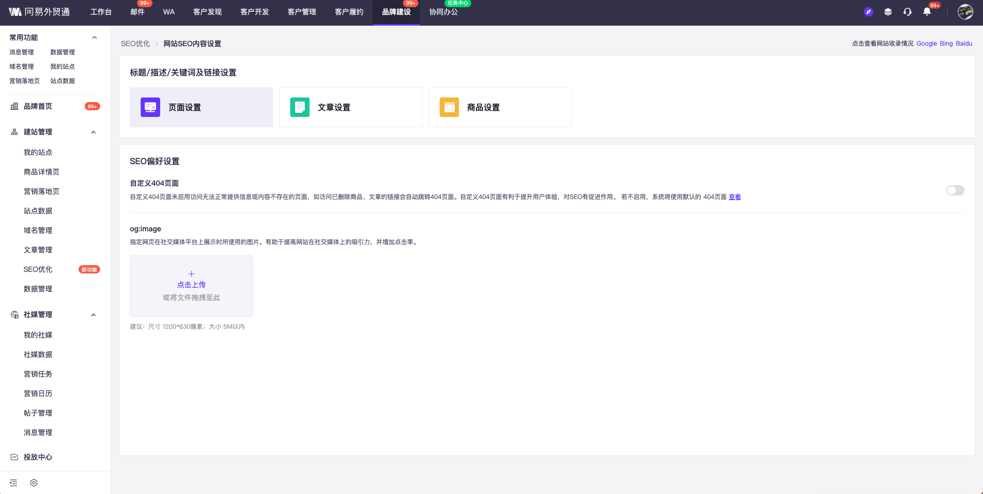 外贸通提供SEO优化所需的基础配置及效果查看能力,暂不提供复杂的关键词研究、外链建设、人工SEO等高阶服务。
