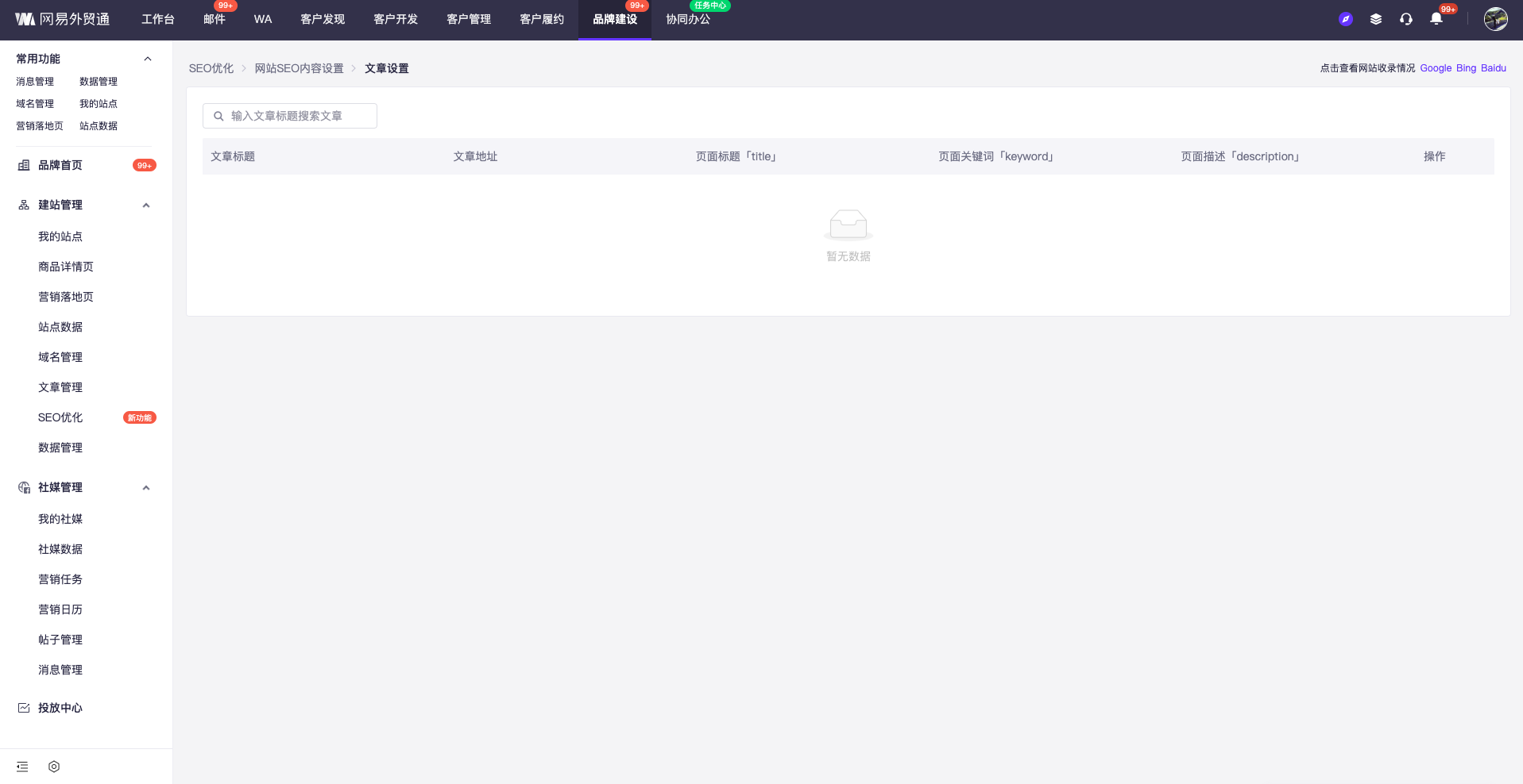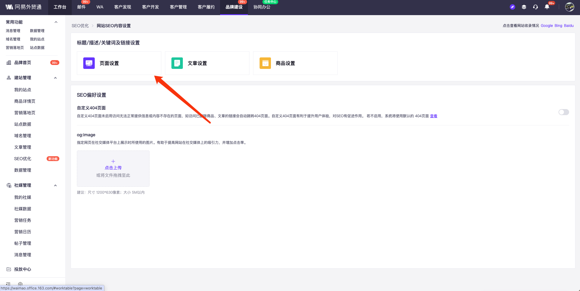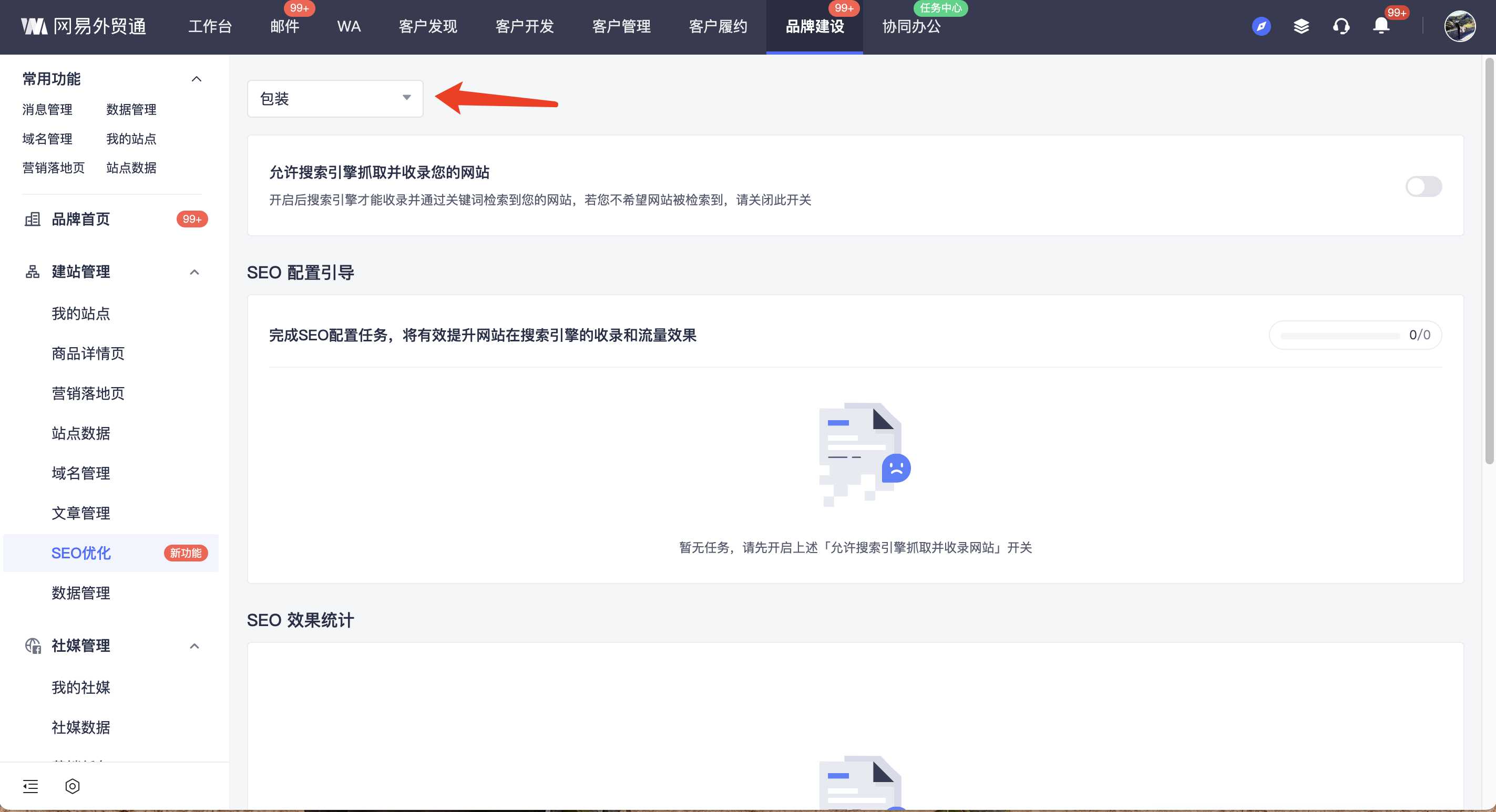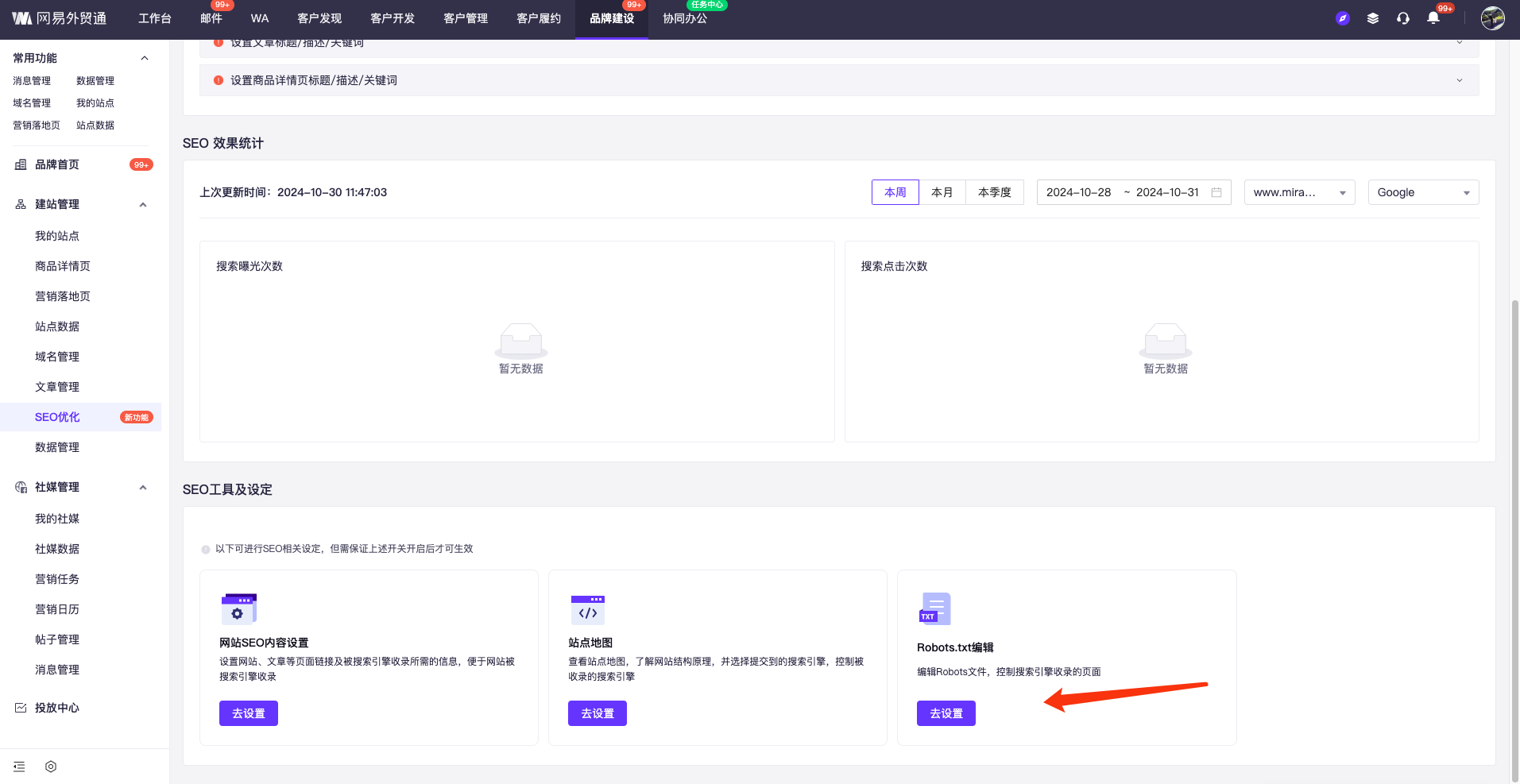外贸通提供SEO优化所需的基础配置及效果查看能力,暂不提供复杂的关键词研究、外链建设、人工SEO等高阶服务。