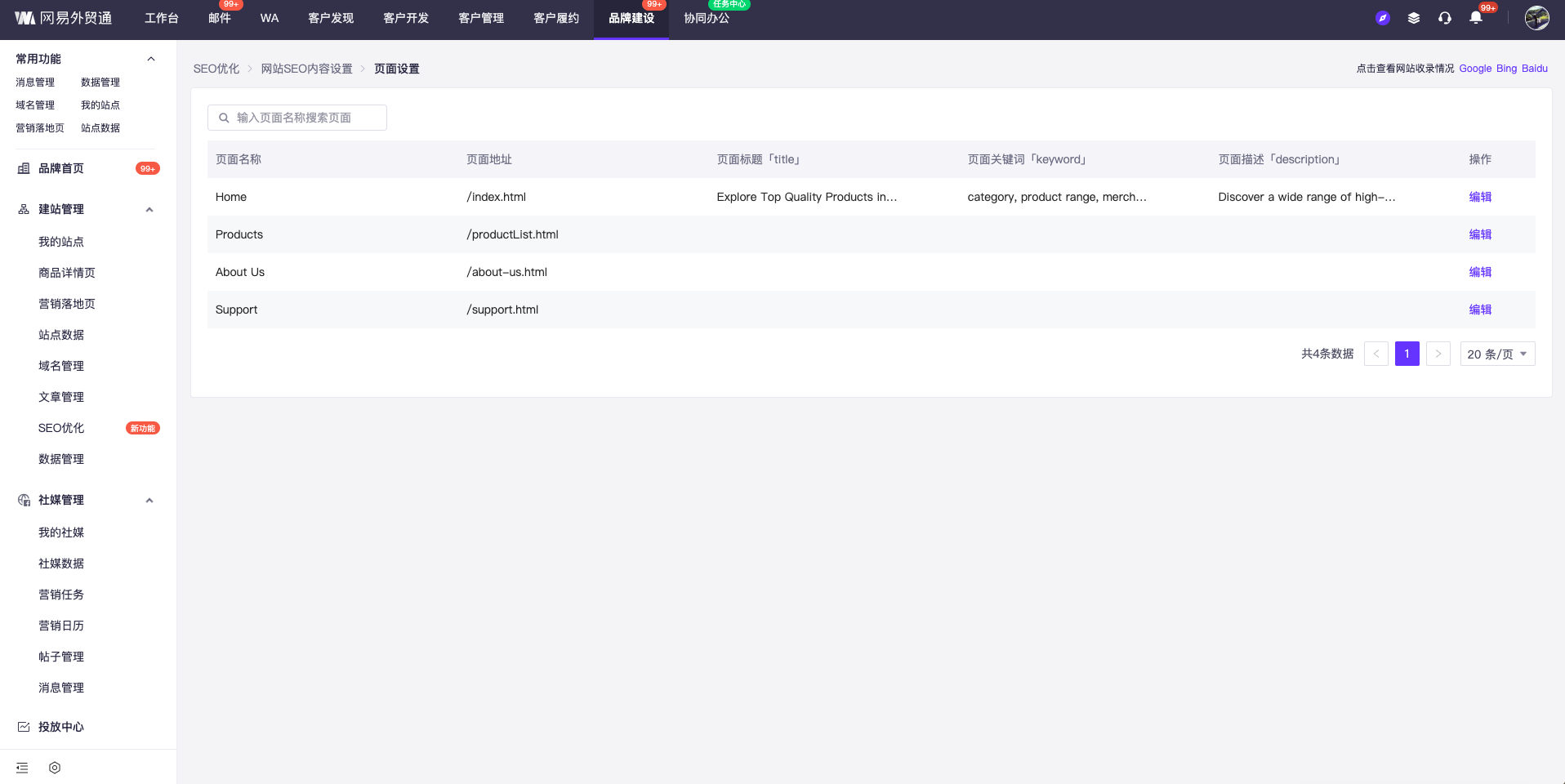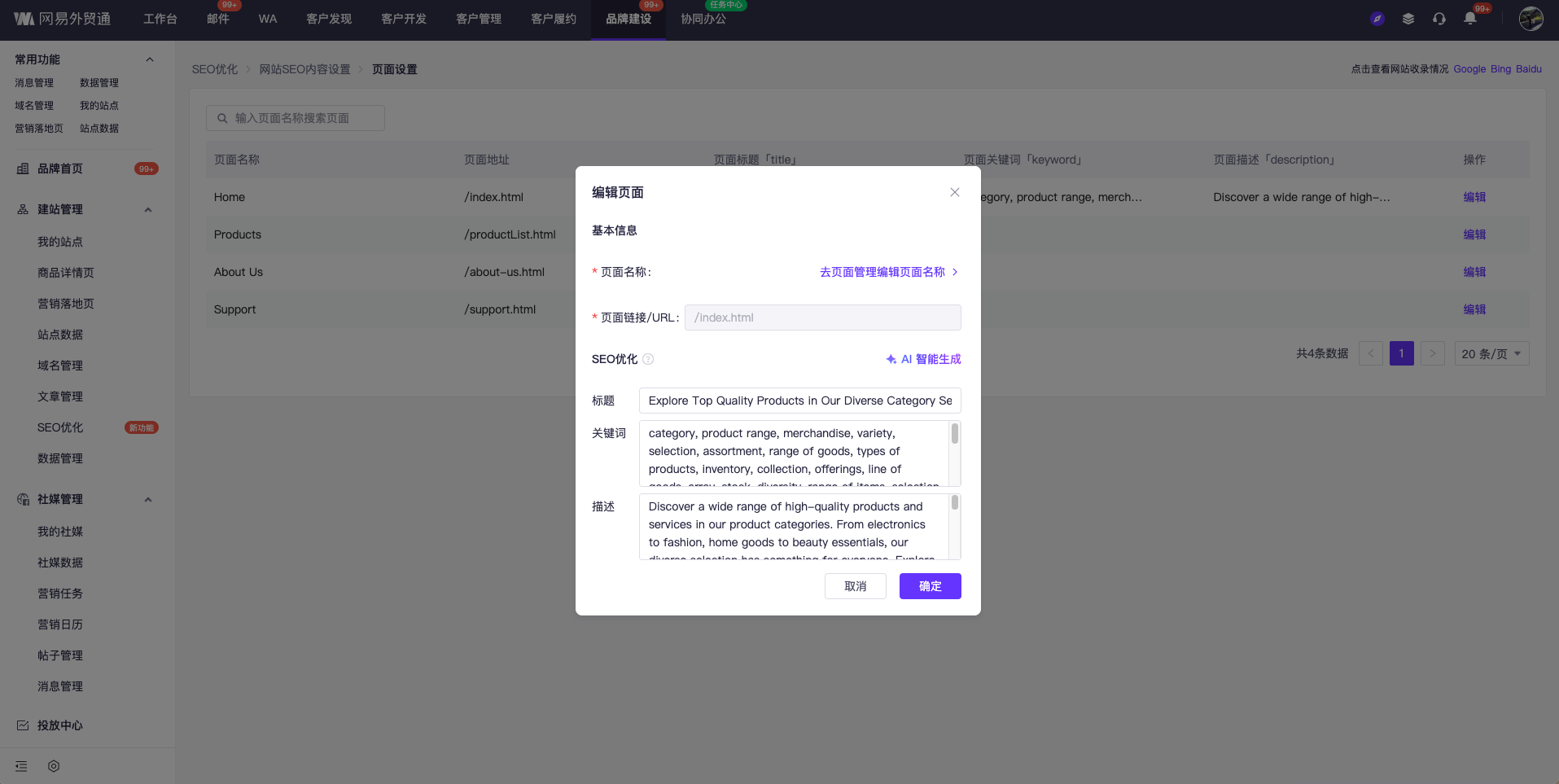 点击「页面设置」,将陈列您的网站所有的页面,在这里您可以点击「编辑」按钮,修改每个页面的URL以及TKD。也可以点击「AI智能生成」,AI将自动生成TKD