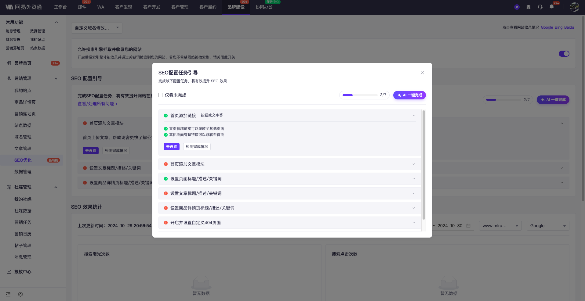您也可以点击「AI一键完成」,系统会自动帮您完成自定义404页面、文章/商品/页面 TKD的生成的操作。