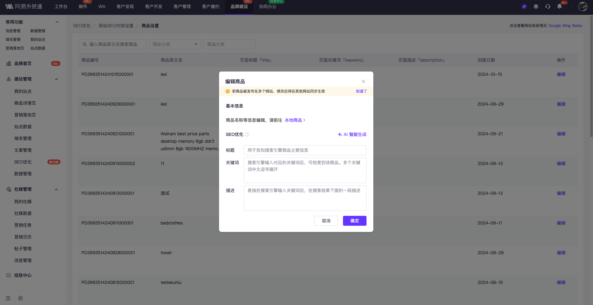 点击「商品设置」,将陈列您的网站所有的商品,在这里您可以点击「编辑」按钮,修改每个商品的URL以及TKD。也可以点击「AI智能生成」,AI将自动生成TKD