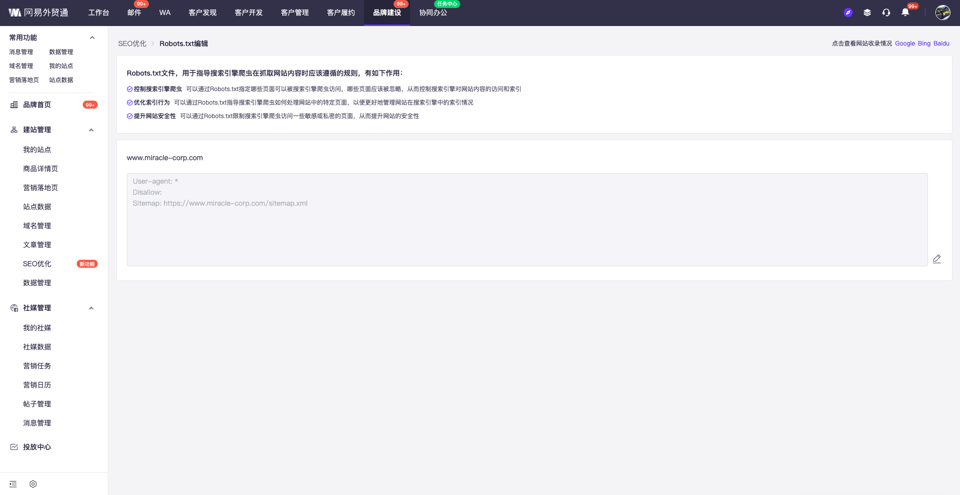 在这里可以控制某些页面允许搜索引擎收录、哪些页面不被收录,可以直接编辑Robots文件