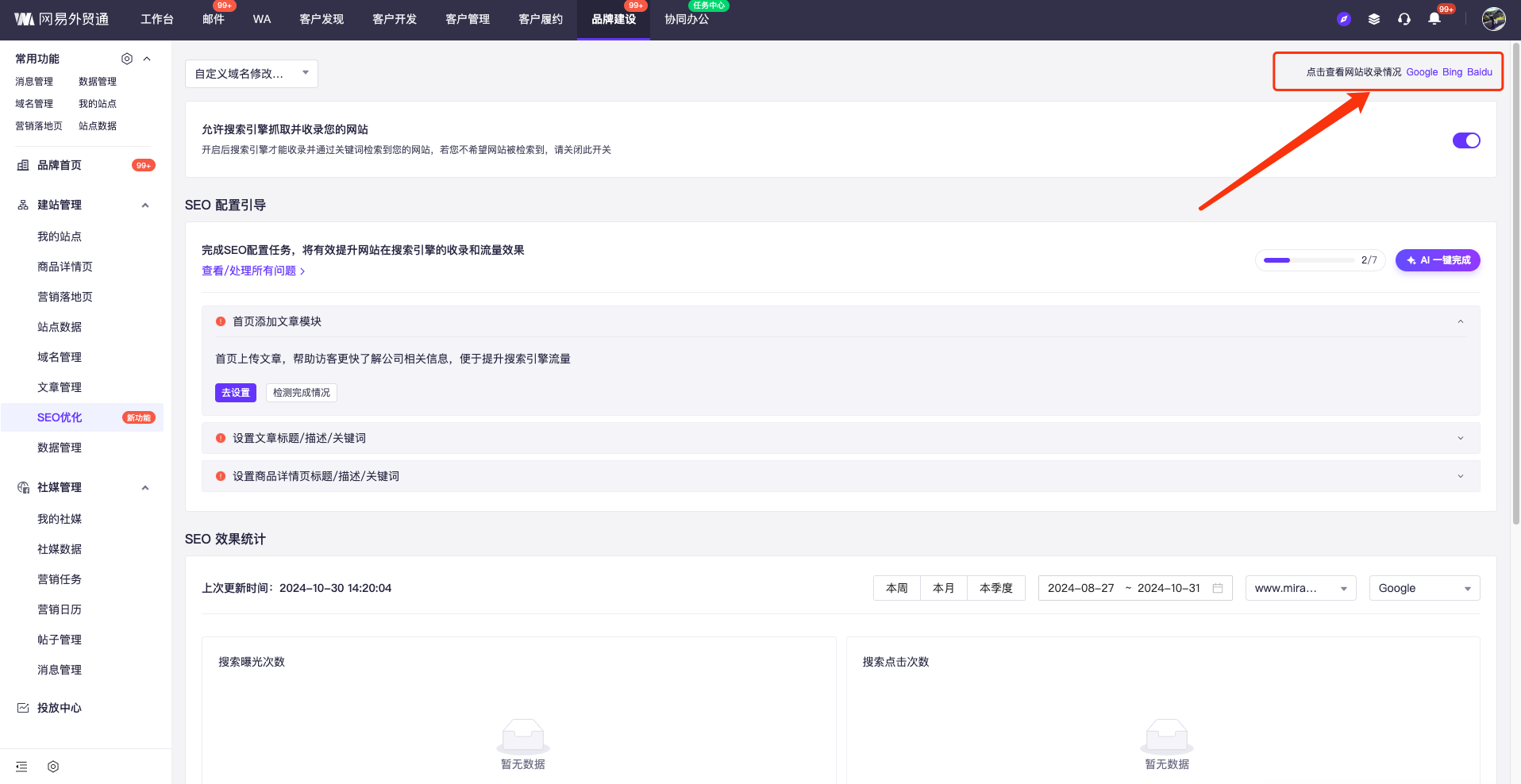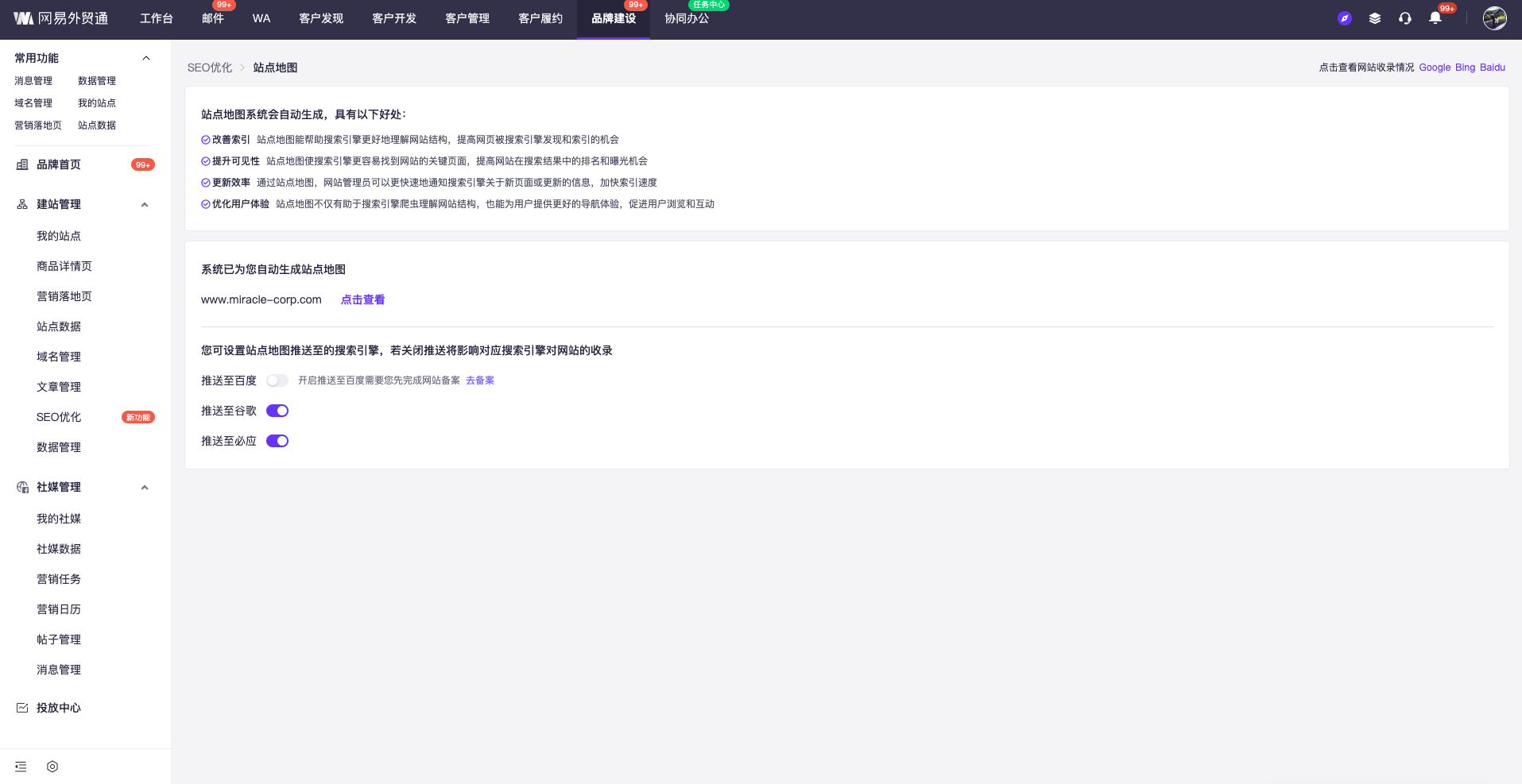 开启后,系统自动生成搜索引擎收录所必须内容(如站点地图),并且自动完成网站到谷歌、必应、百度的收录。