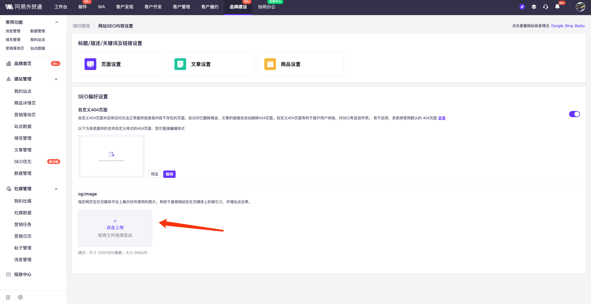 这里设置的是网站发布到facebook、linkedin等社媒平台会展示的缩略图,建议上传贵司的logo即可。