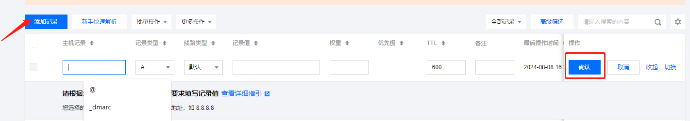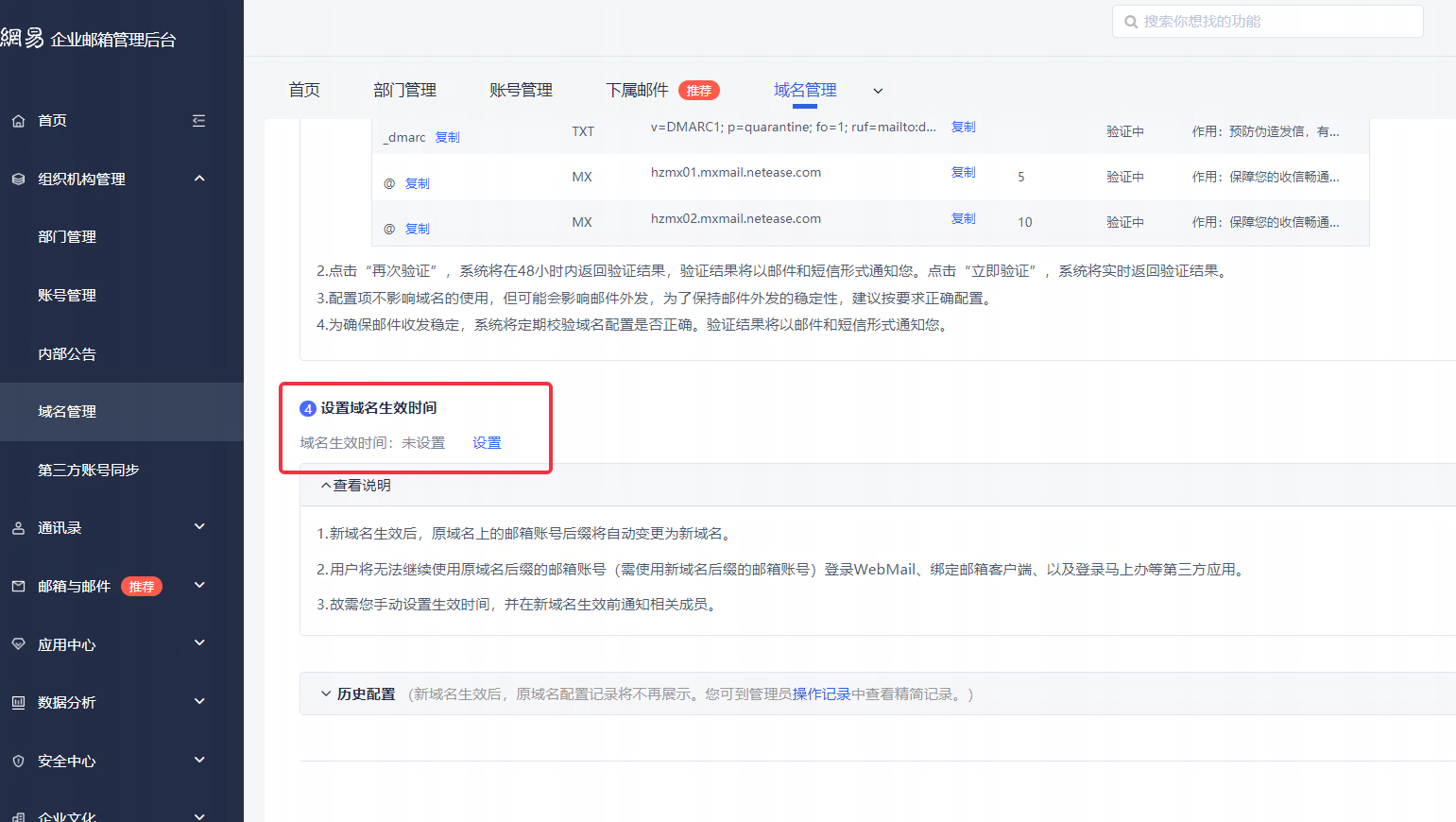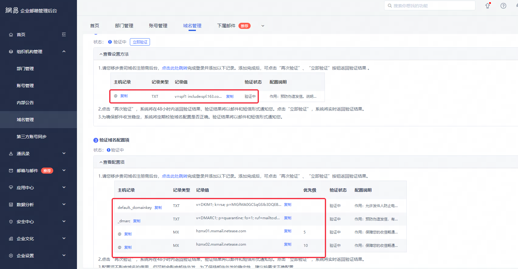 一、需要先在邮箱管理后台修改域名并获取解析记录值: