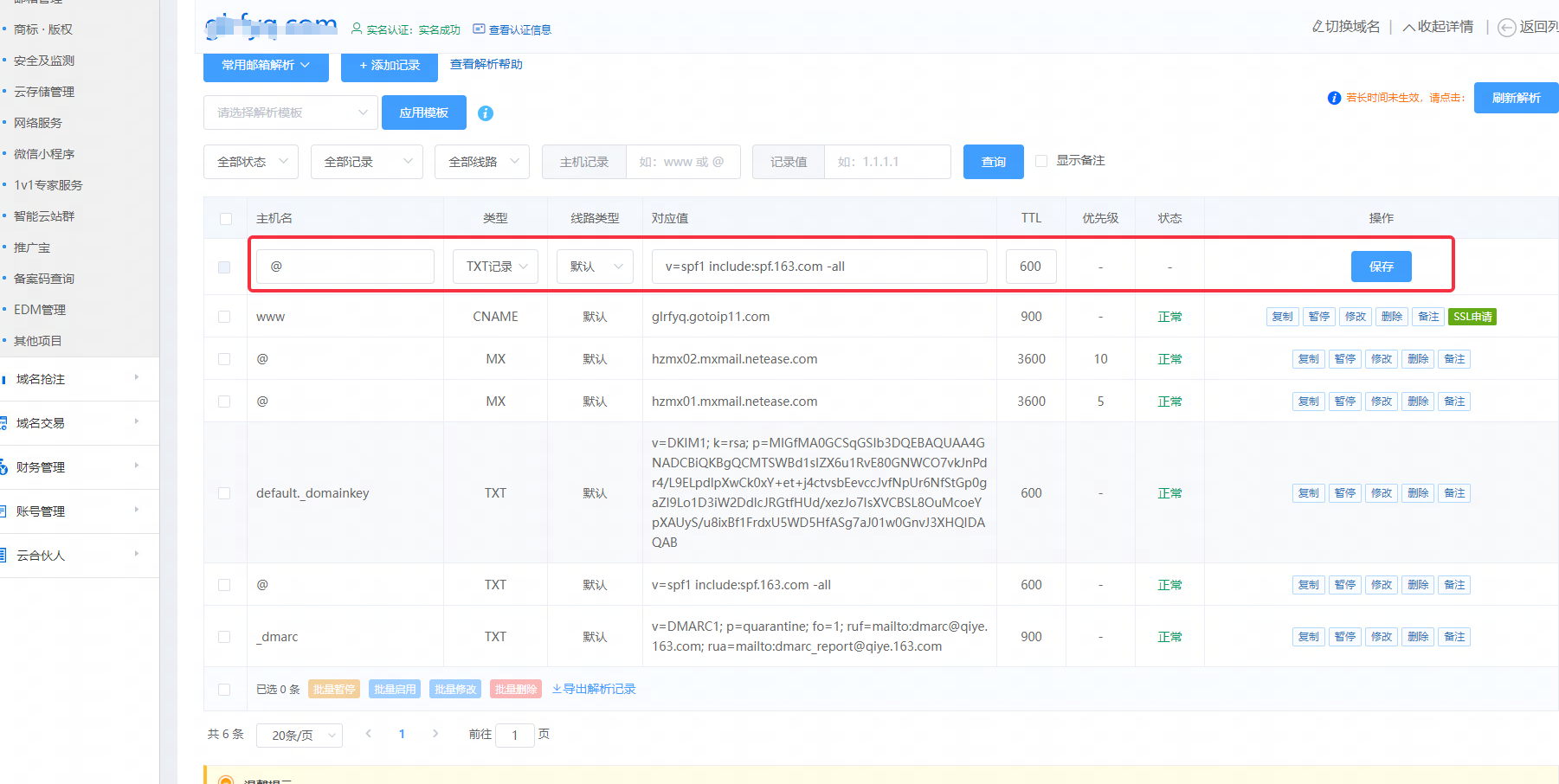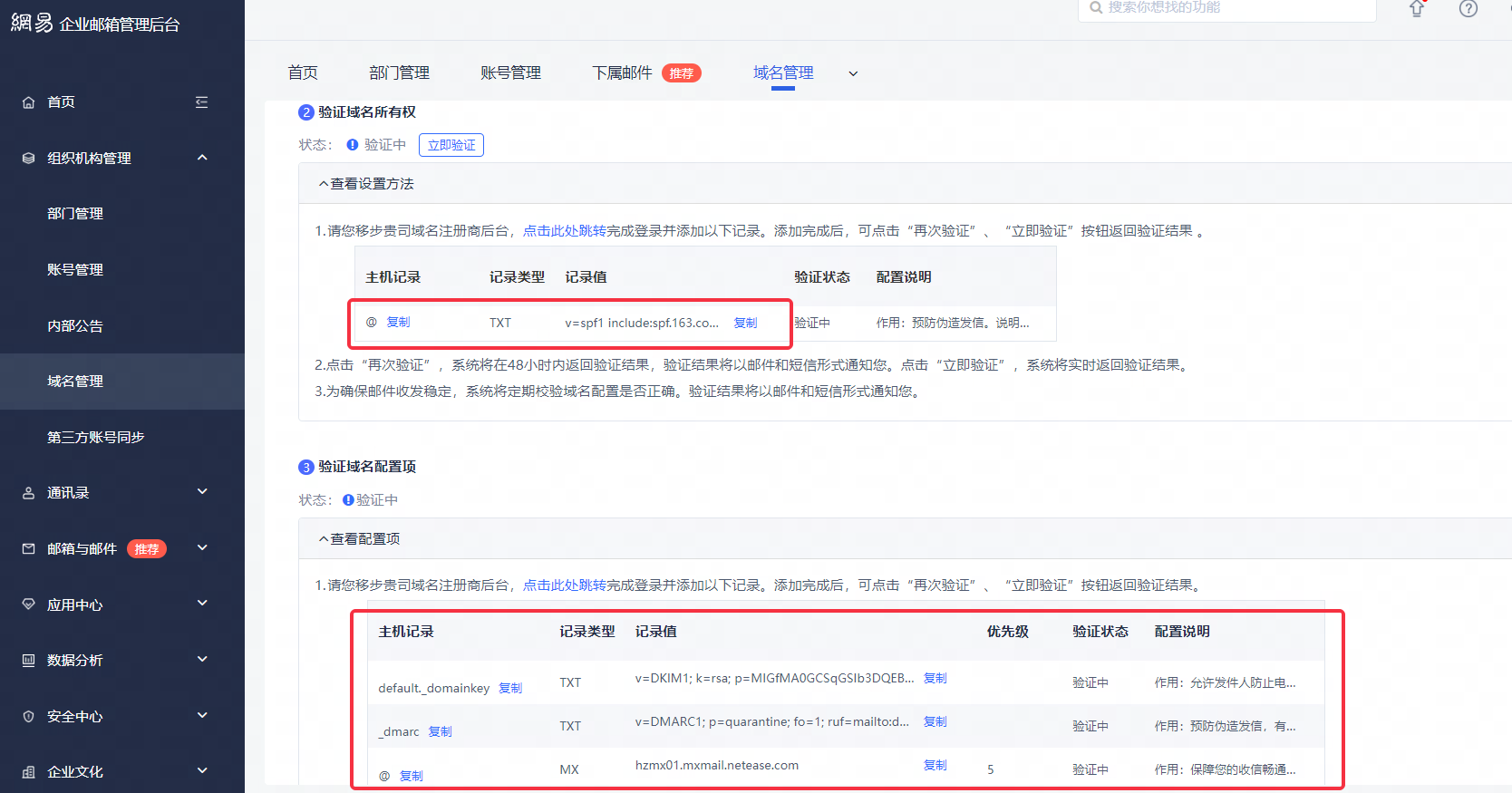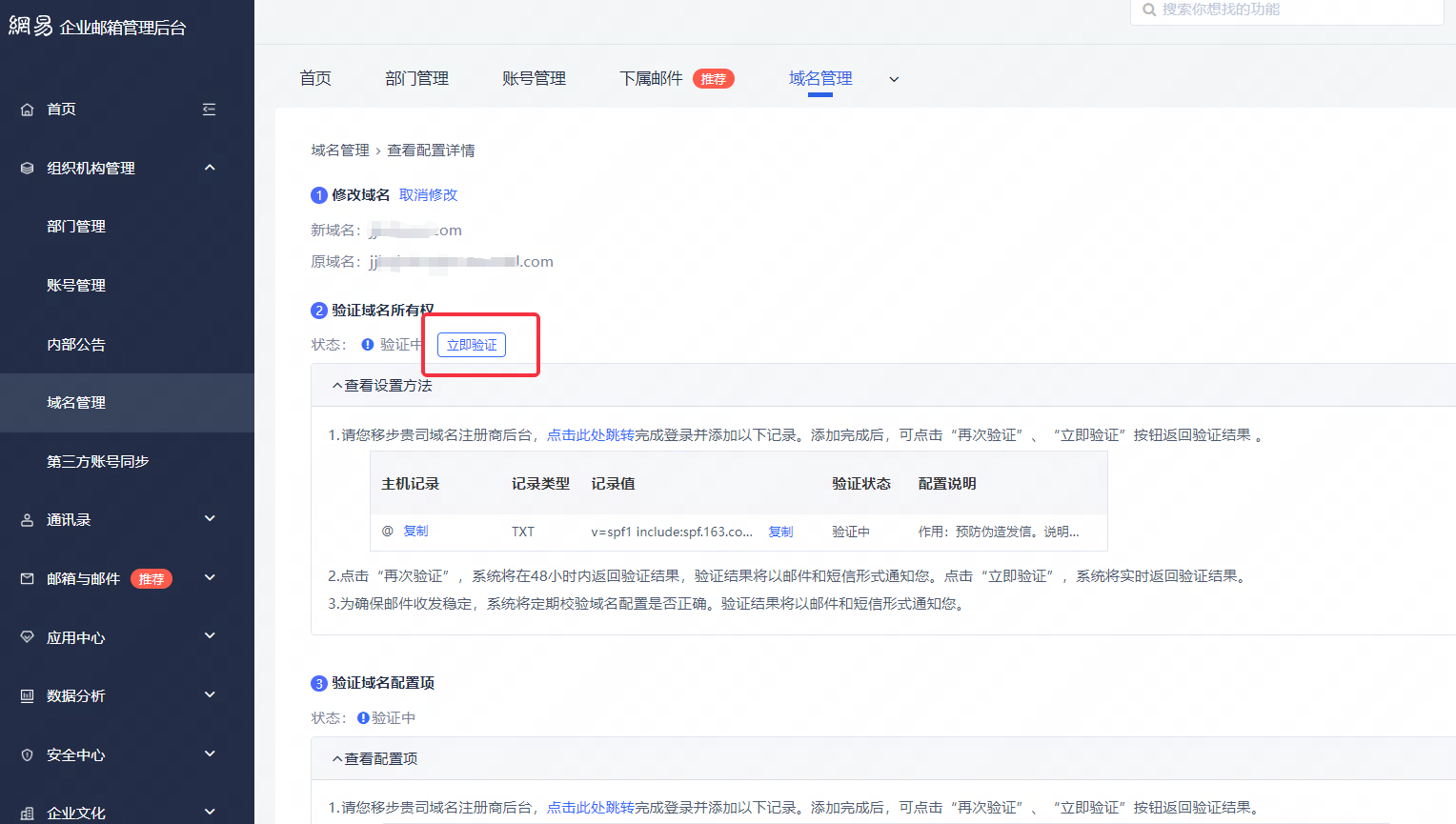 1.首先登录邮箱后台进行域名替换并获取解析记录值: