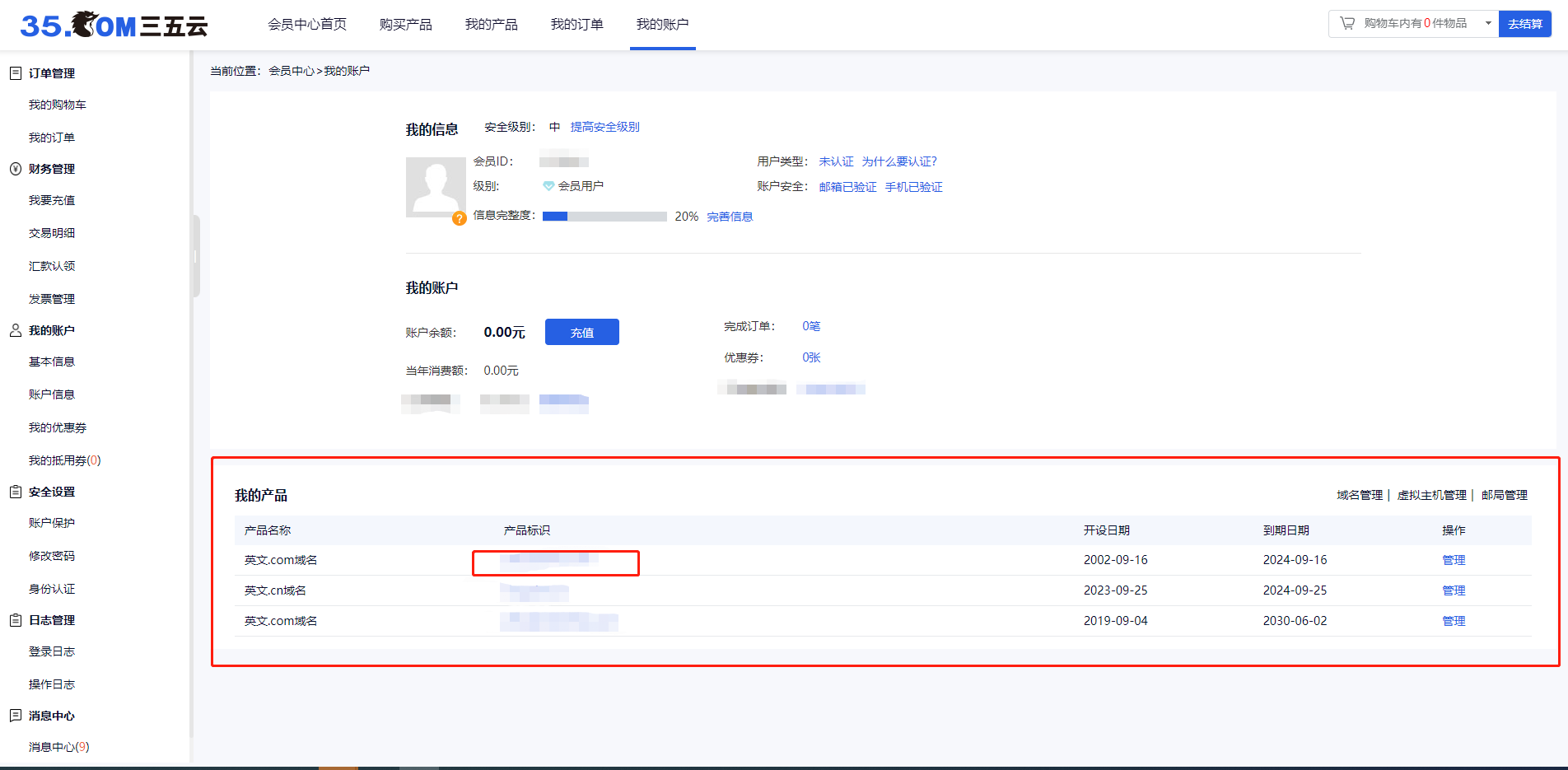 3.找到我的产品下方的域名后点击管理进入页面