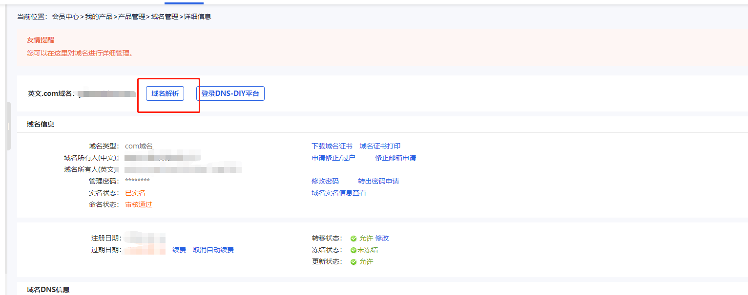 4.进入后点击域名解析进入解析界面