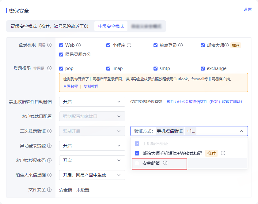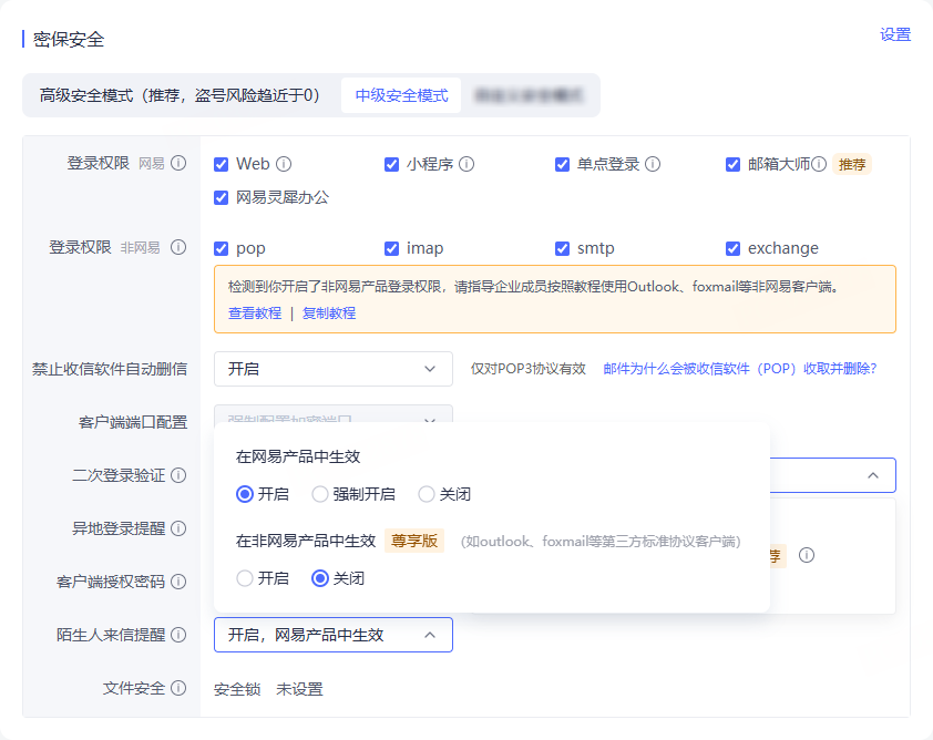本章主要介绍尊享版安全相关内容,保障企业邮件安全,涉及安全设备、登录安全邮箱、陌生人来信提醒。详细内容如下: